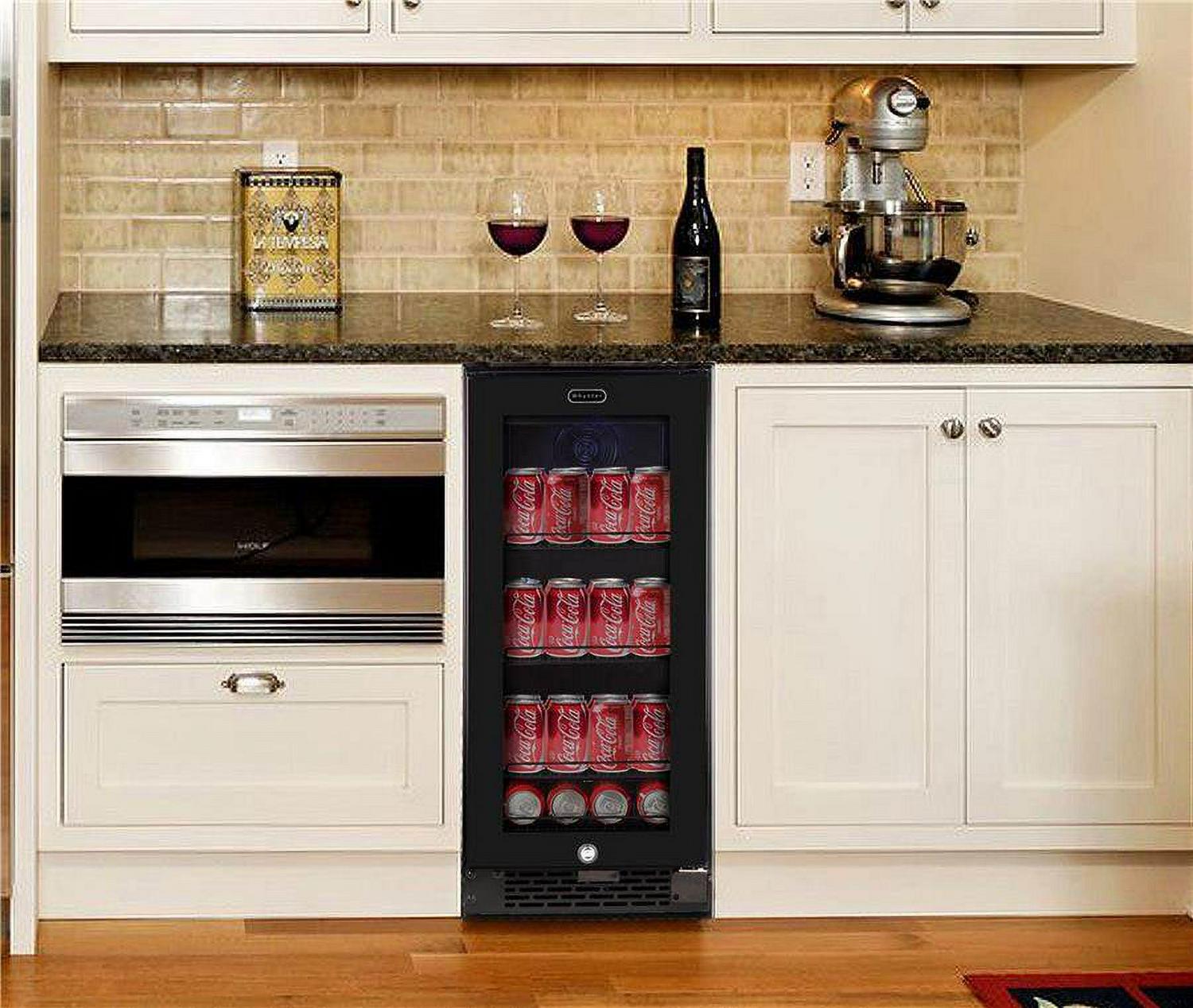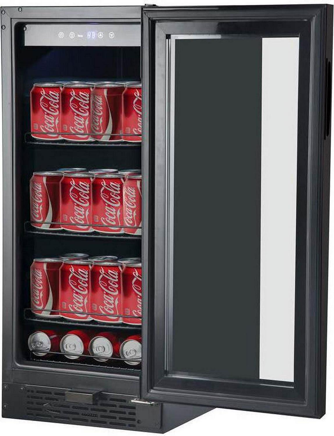The Whynter Built-in Black Glass 80-can capacity 3.4 cu ft. Beverage Refrigerator is a sophisticated addition to any home that is perfect for cooling and storing your favorite beers, wines and canned beverages. With its reversible and elegant full glass door, the 3.4 cu. ft. beverage refrigerator blends well and accents any decor.