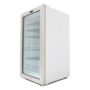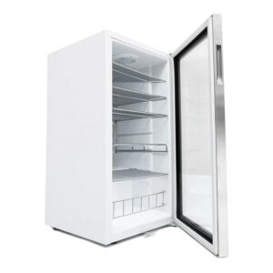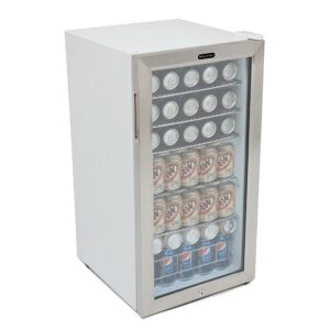 Keep all your favorite beverages cool with the 120 Can 5 Shelf Lockable Compact Stainless Steel Beverage Refrigerator from Whynter. This freestanding beverage refrigerator has 5 removable wire shelves that can store up to 120 standard 12-ounce cans so you can enjoy your favorite drinks anytime. A sleek white cabinet and stainless steel trimmed glass door allow you to see all your beverages without needing to let out cold air by opening the door. With a versatile design, this door can be installed on the right or left side of the appliance to best fit your space. A built-in cylinder lock allows you to keep the contents of this compact refrigerator safe and secure when needed and can be opened with 2 included keys. With a powerful compressor and internal air-cooled system, this refrigerator keeps all your sodas and sparkling water at a consistent temperature all throughout the refrigerator. With a compact design, this 120 Can 5 Shelf Lockable Compact Stainless Steel Beverage Refrigerator from Whynter is ideal for keeping all your favorite drinks cool and ready to drink.
