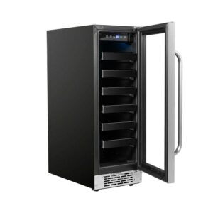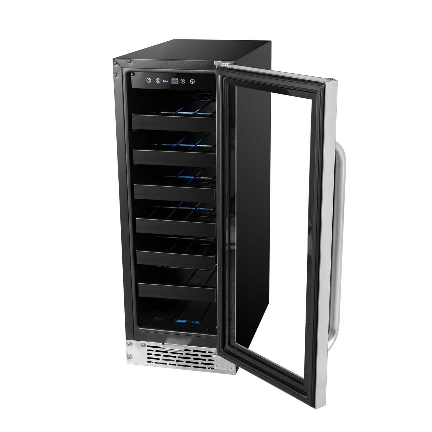 Our Whynter Built-In Under-Counter Stainless Steel Wine Refrigerator offers premium quality and innovative design ideal for your wine collecting needs. Whether for the enthusiast or the connoisseur, this single zone compressor wine refrigerator provides premium and advanced wine storage functionality. The Whynter BWR-208SB can hold up to 20 standard 750ml wine bottles.The powerful compressor cooling process offers optimum temperatures (low 40F to mid 60F) for red, white, and sparkling wines. The front ventilation design allows for flush with cabinet installation or simply freestanding usage. The premium appeal of this wine refrigerator features a substantial stainless steel trimmed door accented with a luxurious curved handlebar. Designed with intuitive use in mind, this refrigerator comes equipped with a sleek touch screen control that lets you set the temperature to anywhere from 40F 65F / 5C 18C.Built-in or Freestanding CapableThe front ventilation design of this unit allows for flush with cabinet undercounter installation or simply freestanding usage.Premium DesignUsing premium materials, this wine storage unit sets its appearance apart from your conventional wine refrigerator. Designed with intuitive use in mind, this built-in wine refrigerator comes equipped with a sleek touch control that lets you set the temperature to anywhere from 40 65F.Activated Carbon FilterEquipped to ensure optimum air quality within the wine cabinet. This filter counters and prevents any contaminants and odors from the ambient air from affecting the taste of the beverage stored.Safety LockSecure your wine collection with the built-in door lock and key set.