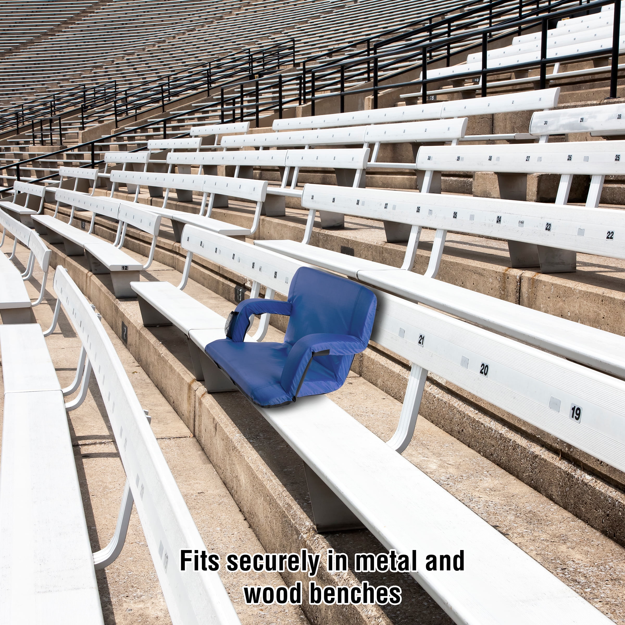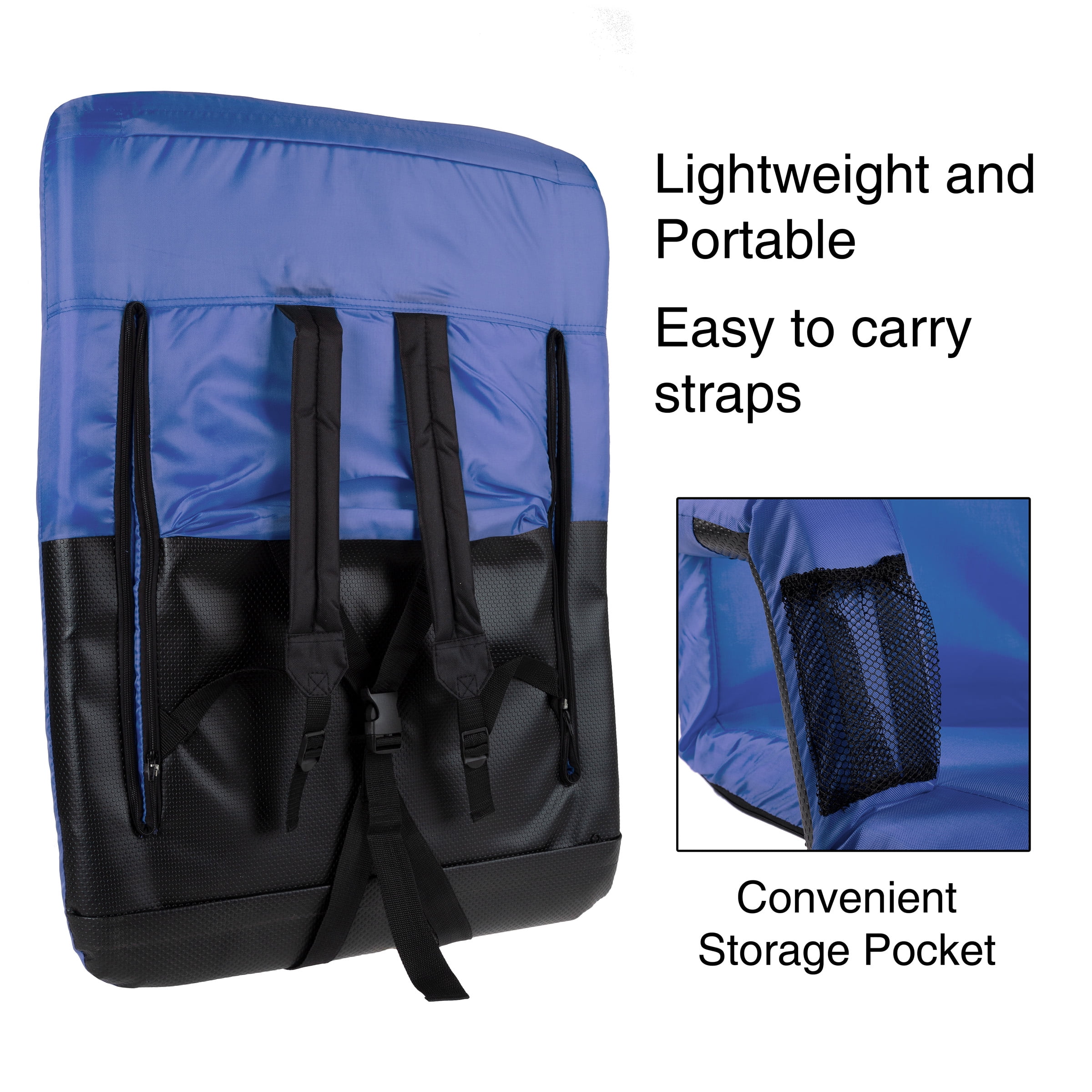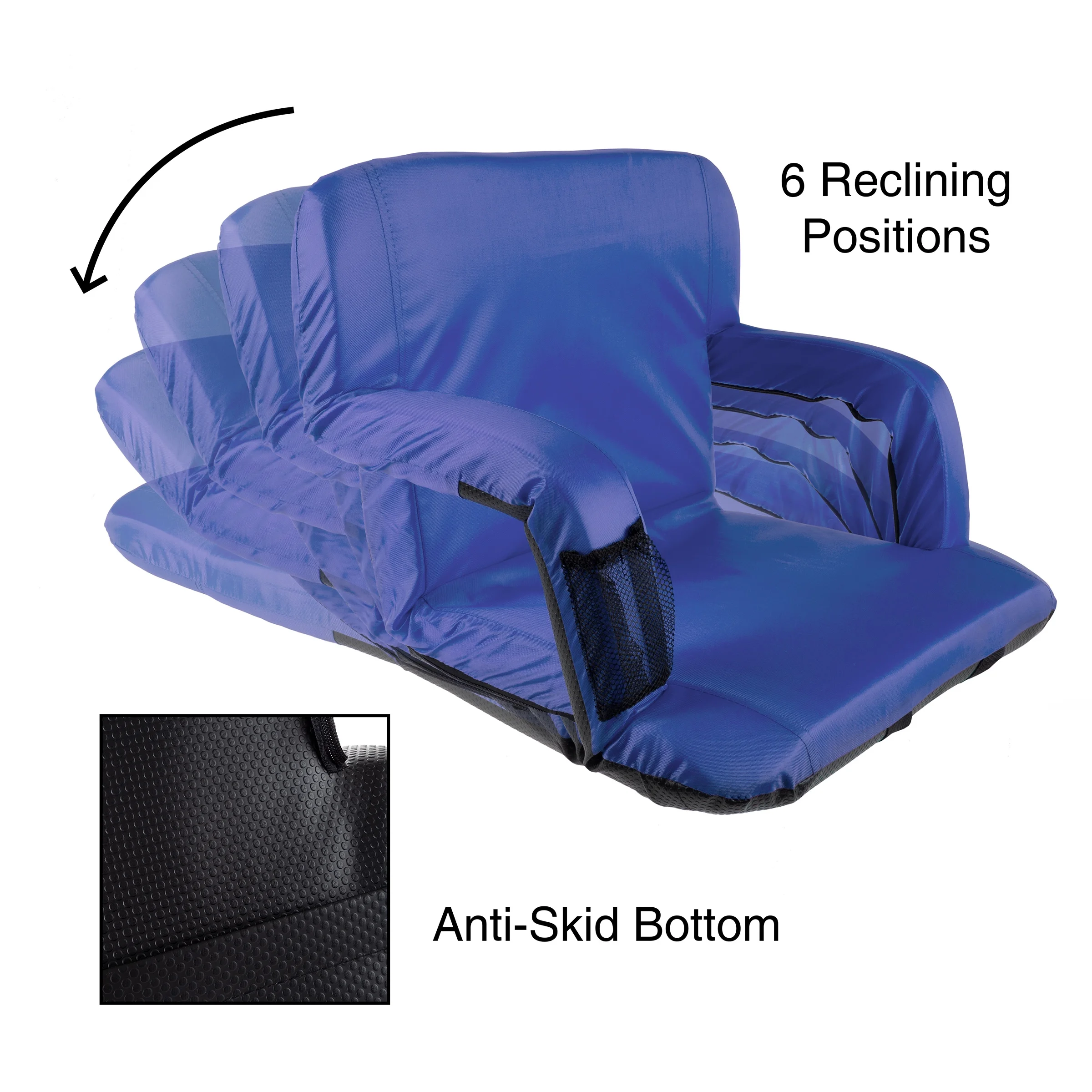 CUSHIONED COMFORT – With back support, arm rests, a wide seat, and plush cushioning, this stadium seat will provide ultimate comfort at any event- especially on bleachers, benches, or the ground! 6 RECLINING POSITIONS – This folding chair has 6 different reclining options for a dialed in fit. Just push the seat back to adjust the chair position to an angle that is the most comfortable for you! LIGHTWEIGHT AND PORTABLE – The lightweight cushioned bleacher chair folds flat between uses, and has two backpack style straps for easy portability and on-the-go seating. MULTIPURPOSE – This seat has a skid and water resistant bottom so it can be used for a variety of events and activities. It is perfect to use at sporting events, outdoor camping, boating, concerts, the beach, or even just for extra seating at home. PRODUCT DETAILS – 24.5 inch wide seat, 17.5 inch long seat, 18 inch backrest, 3 inch armrest on each side. Materials: 420D PU coated polyester, high density foam filling, & steel tube.