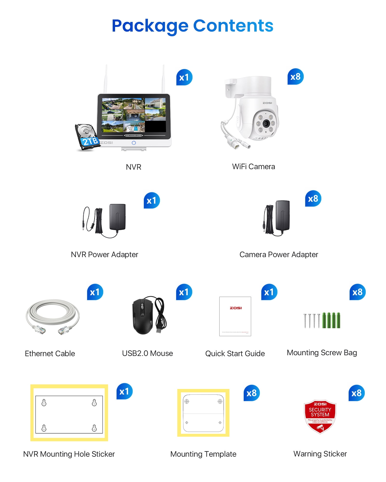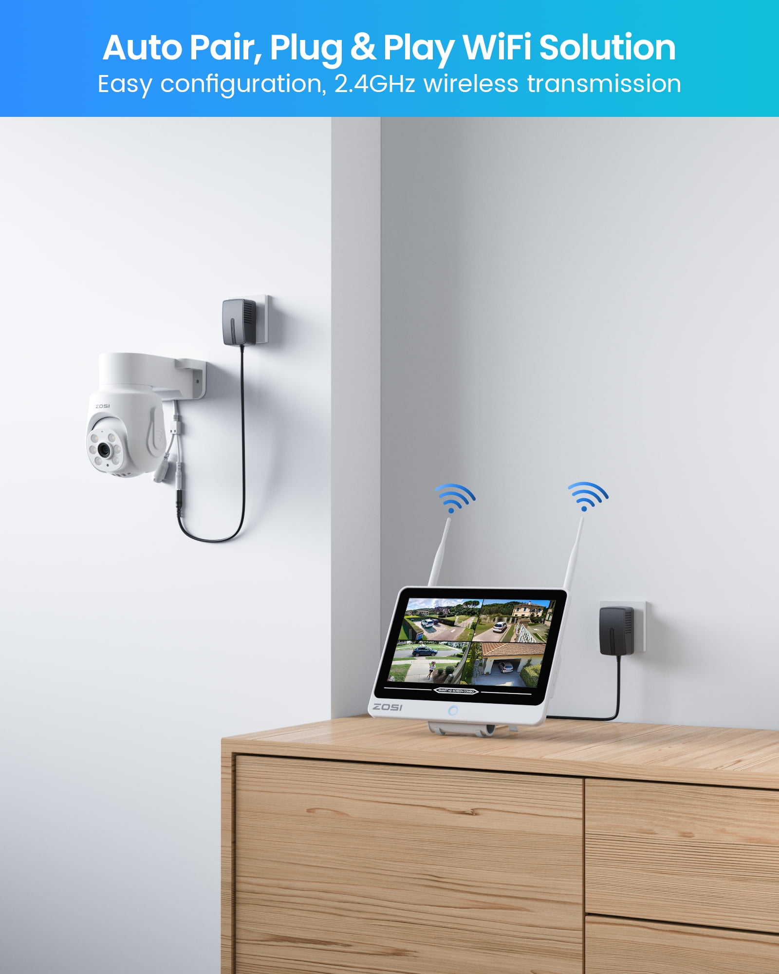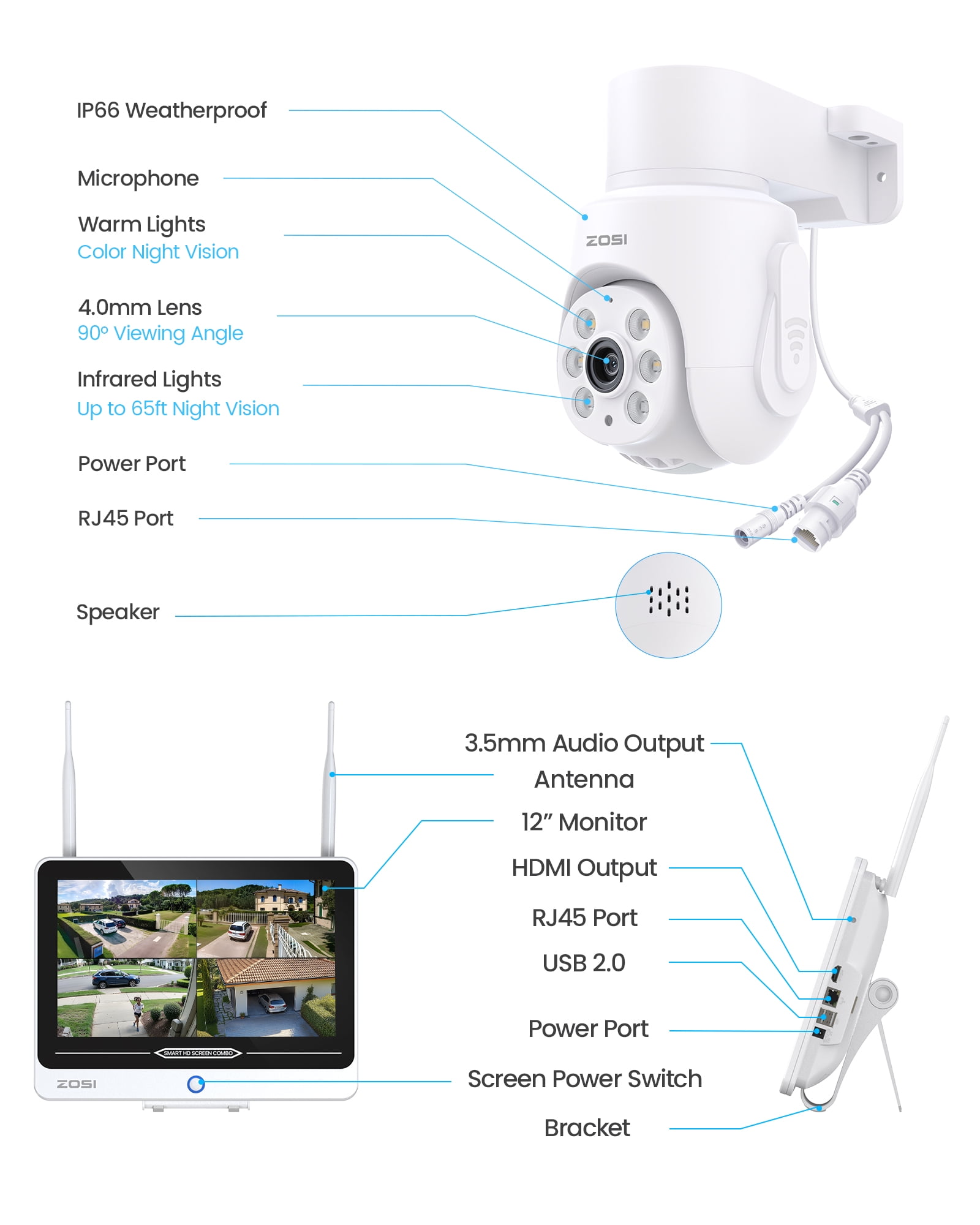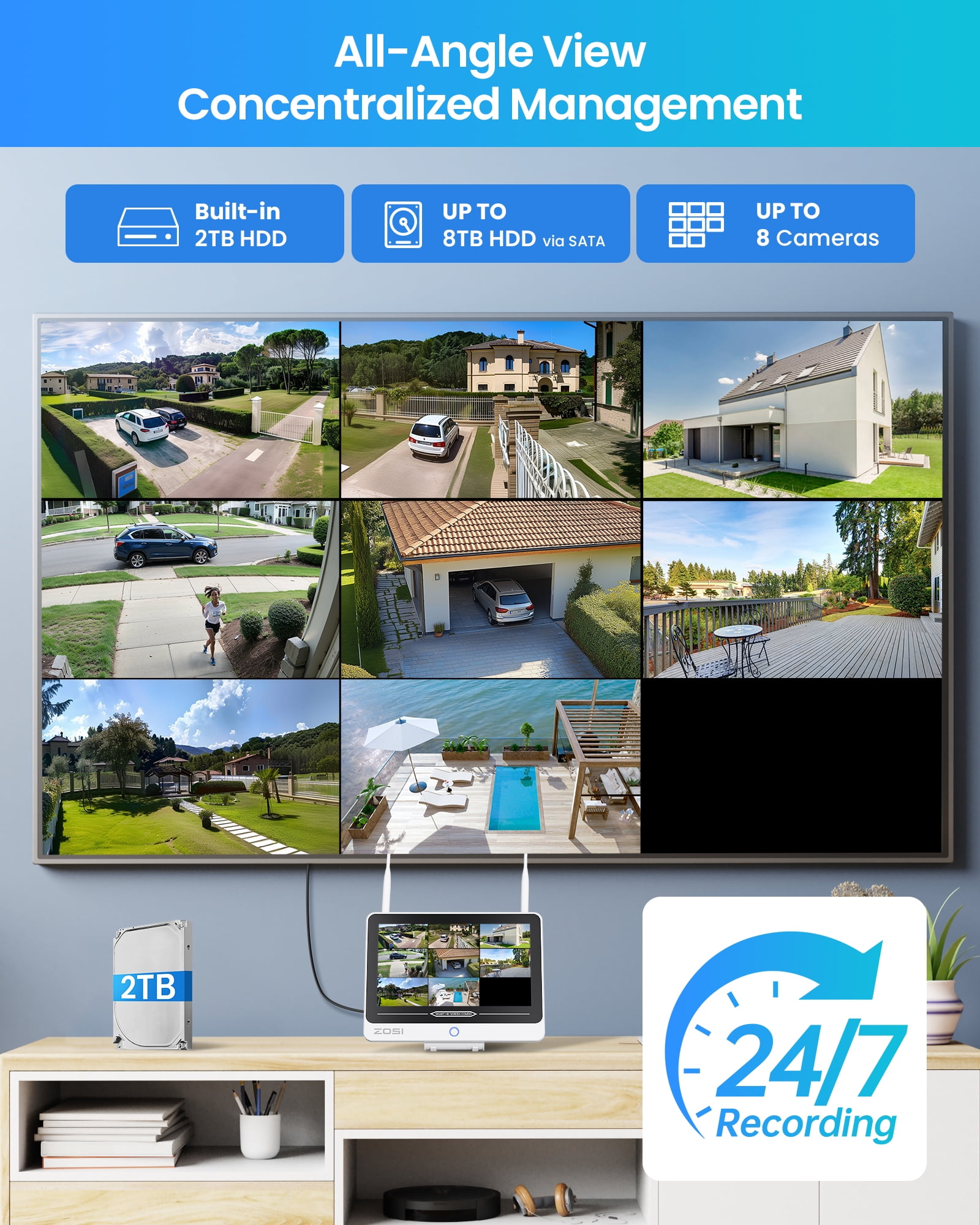 Note: Please make sure NVR is connected to your router by Ethernet cable. 【2K 8CH Camera System】 This WiFi Security Cameras System built-in 12.5″ LCD Monitor. The WiFi cameras and NVR monitor are auto-paired during the factory setting. Note: It need to connect the cameras and NVR Monitor with Power Supply. 【AI Human Motion Detection & Smart Light Alarm】 With advanced AI Human Detection technology, enables the camera to intelligently detect body shape and face pattern. Alert and react to any potential danger via smart light and sound alarm system when triggered by human motion events. Built-in brilliant white lights and high-pitched siren offering double insurance and let you stay protected even when you are asleep. 【Two-way Audio & Remote Access】 Built-in mic and speaker let you stay in touch with your household. Check in with the family or tell your dog to stop barking, or say hello through the ZOSI Smart App. Free app for live view & Playback on Mobile Phone anywhere anytime, you won’t miss any moment with remote and local playback. 【24/7 Recording with 2TB Hard Drive】 With 2TB Security Grade Hard Drive,Users are provided reliable 24/7 recording.Support long continuous recording and backup.NVR can be set to automatically overwrite the oldest internally stored footage or you can transfer those video files by USB to a memory stick or external Hard Drive. 【Noted】 The cameras and the NVR require the power connection. They are not Battery Cameras.Wireless security cameras connect wirelessly to a NVR. They are designed for continuous recording,which requires them to be plugged in to a power source.