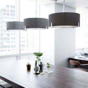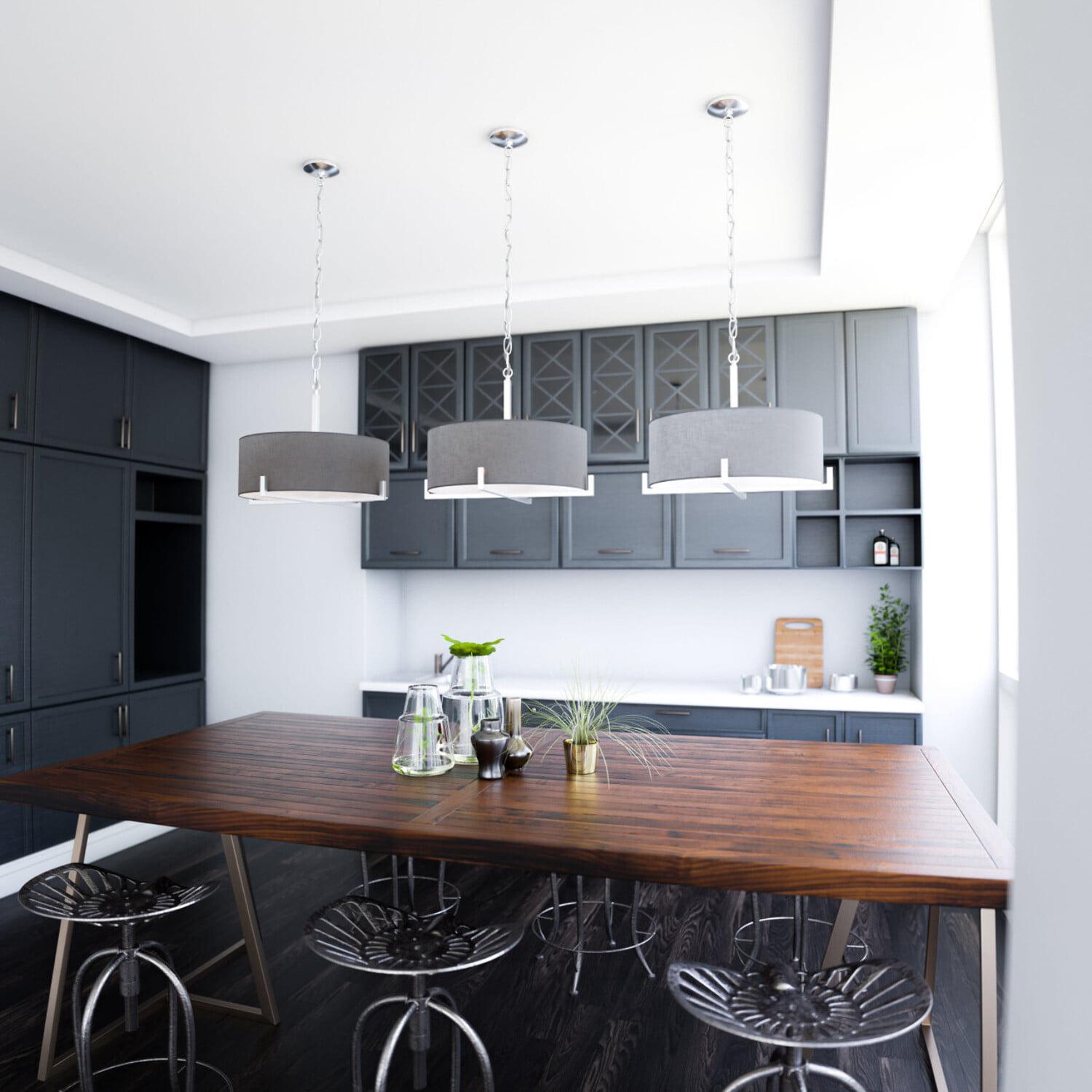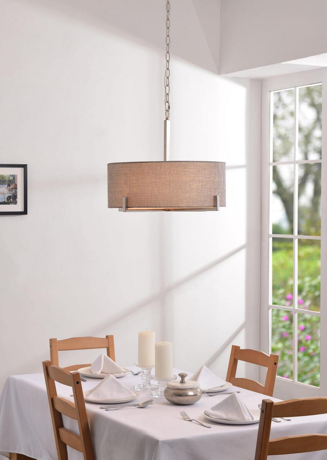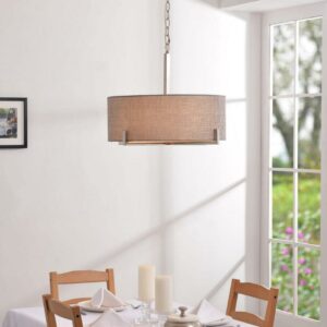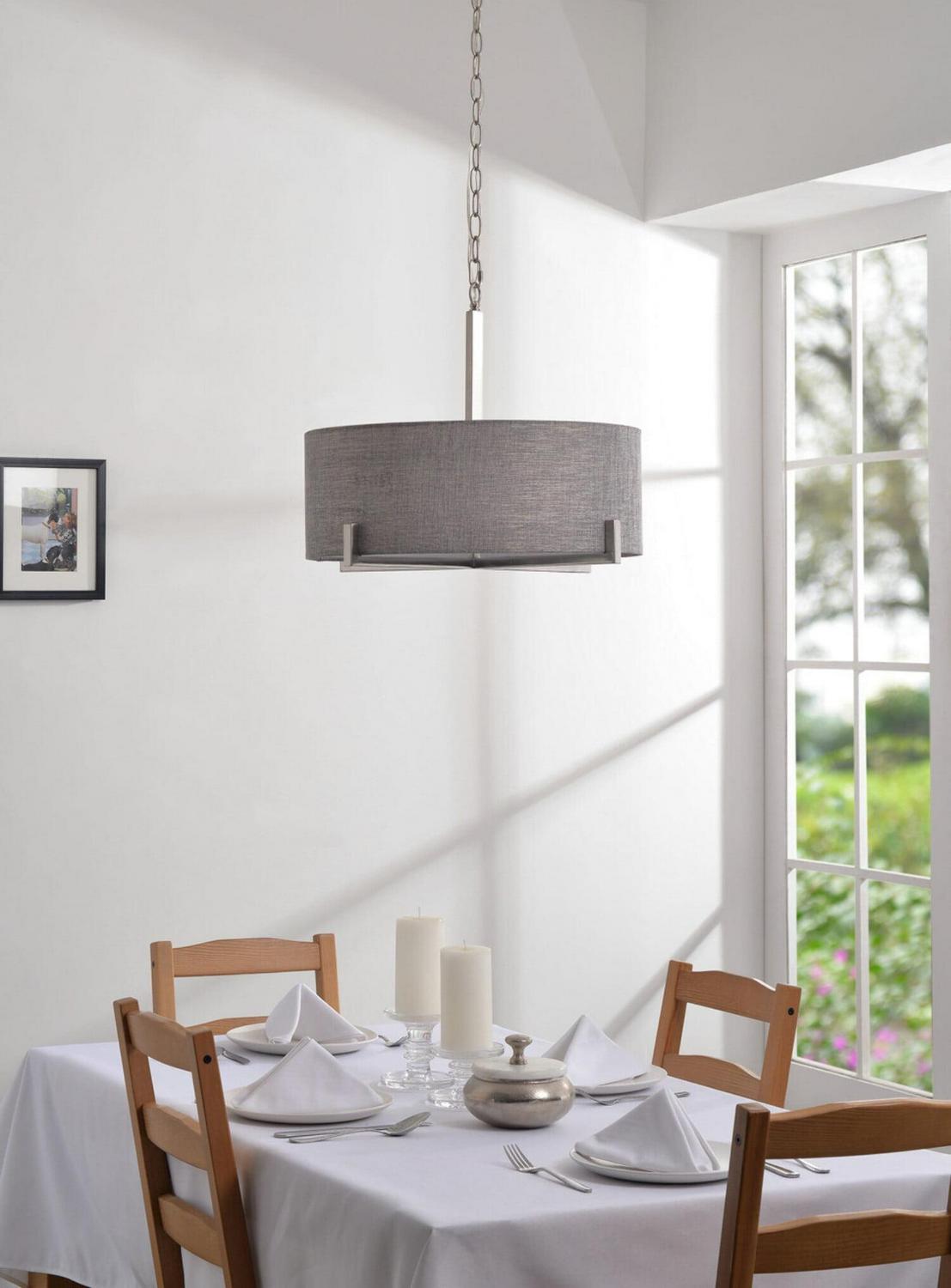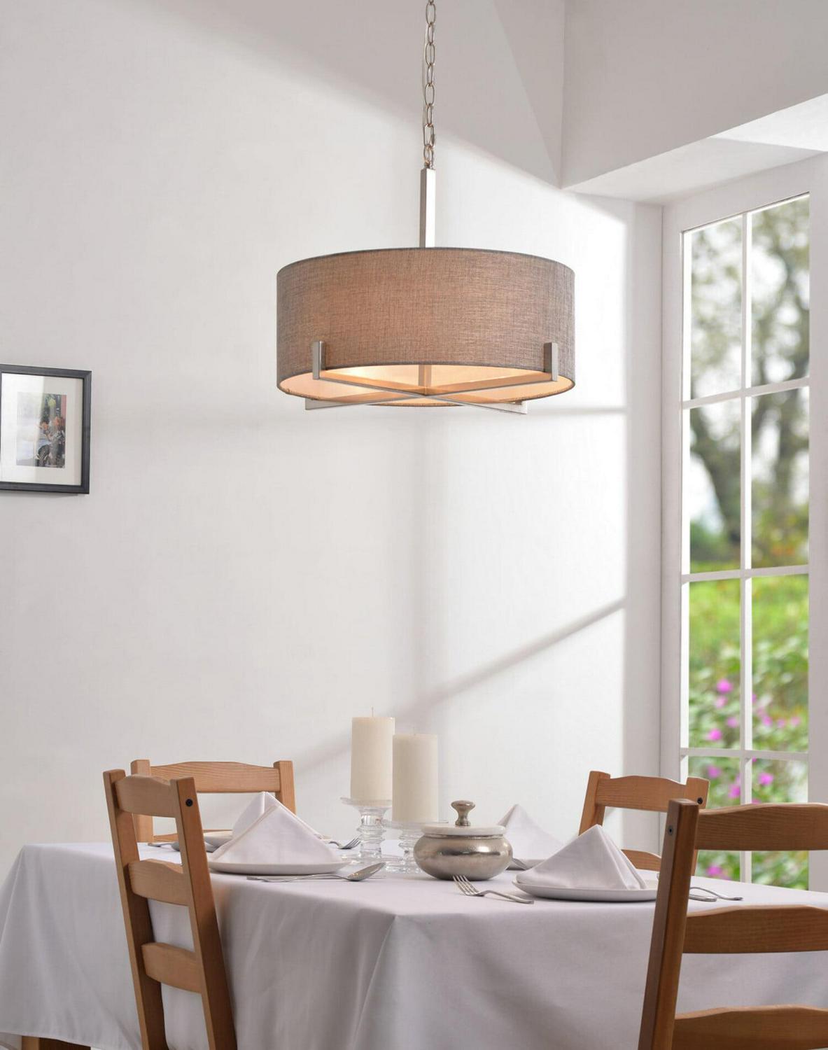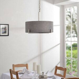 – Transitional Design: The Soft Gray Textured Drum Shade Contrasts With The Angular Clean Lines Of The Bottom Brushed Steel Frame. Endlessly Versatile, Install This Drum Pendant Over Your Glass Dining Room Table For A Clean, Urban Modern Look, Or Over Your Casual Mixed Material Living Room. The Warm Gray Fabric Helps Soften Minimalist And Contemporary Living Areas, Making This Pendant The Ultimate Transitional Accent.