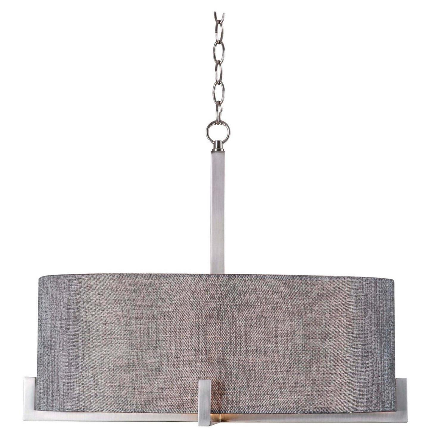 Contrasting shapes and textures are expertly blended to create a harmonious 4 light pendant. Finished in a soft, warm gray and brushed steel, the gray textured fabric drum shade is held aloft by a bottom metal frame and brushed steel hardware. Perfect for use in a transitional dining room, this versatile design is perfect for contemporary entryways, vaulted rooms, sloped kitchen ceilings and more.