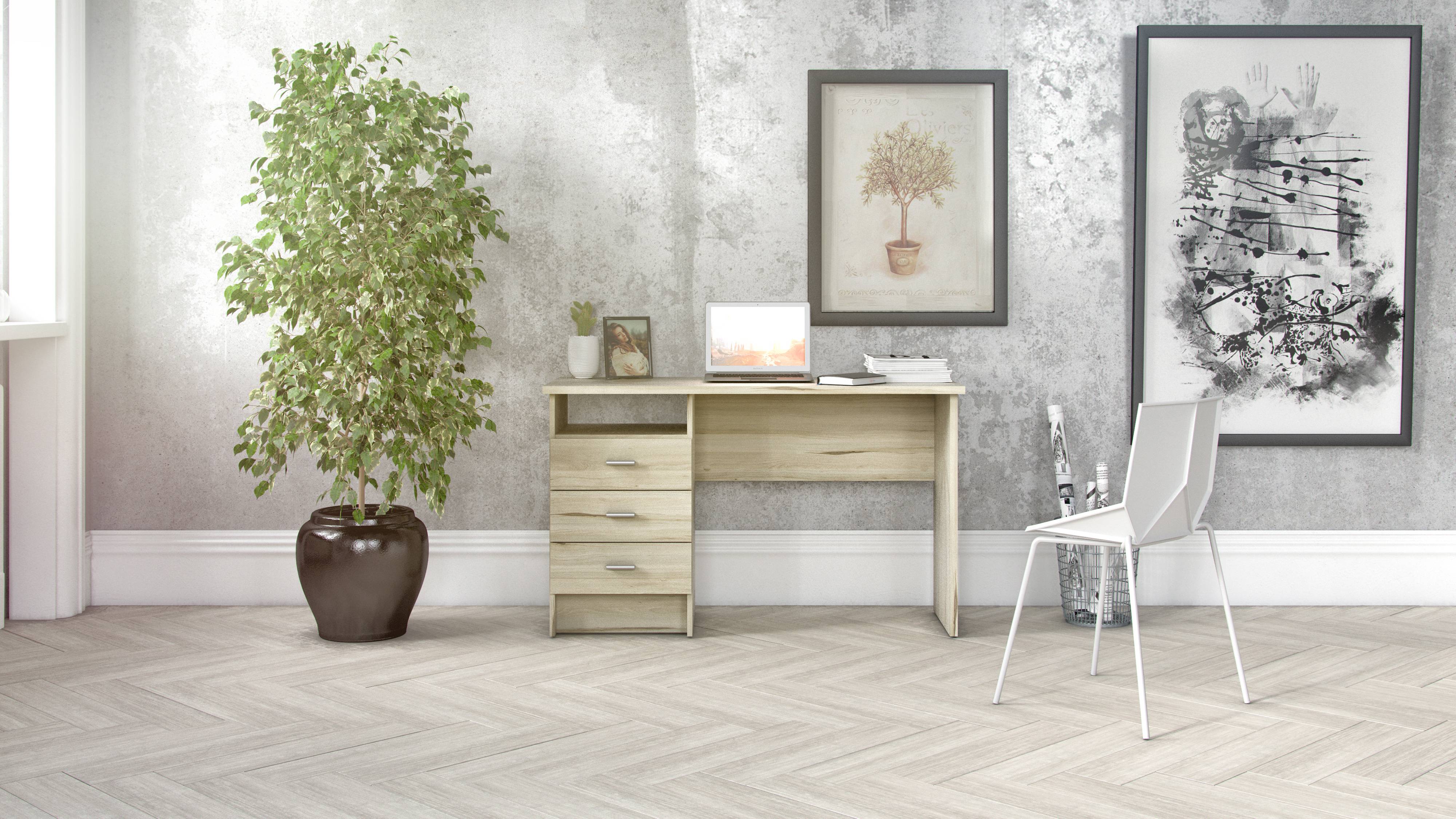 Adds function and style to your living room or home office Three drawers and one fixed open shelf Wire management on desktop, Modesty panel Drawers retract smoothly on metal glides Aluminum bar handles Product is shipped in 1 box Made from engineered wood Made in Denmark Scandinavian look and design Includes assembly manual and all necessary hardware and fasteners. Components are pre-drilled and pre-cut ready for easy assembly!