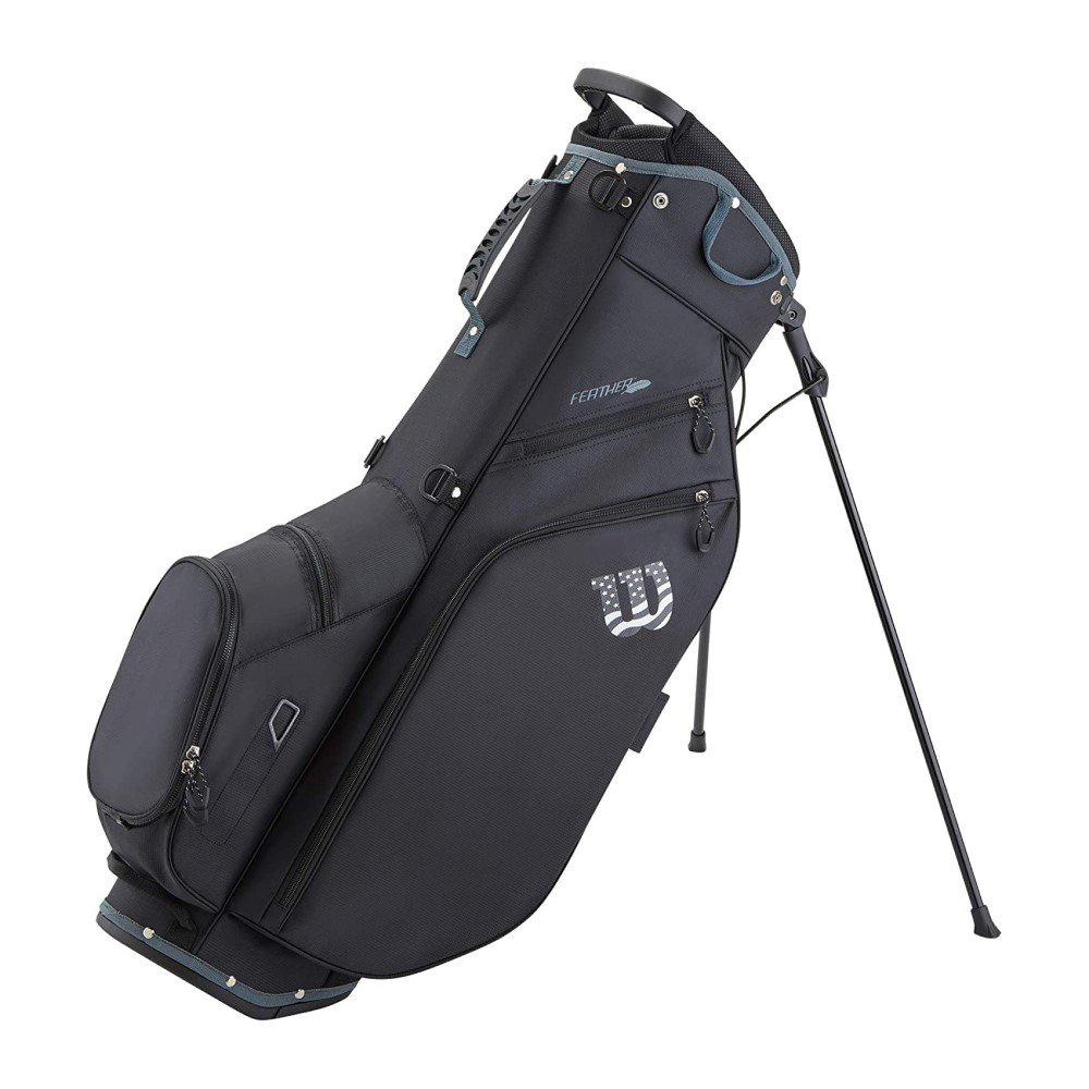 The Wilson Feather Carry bag has been designed to deliver everything you need in a functional golf bag, while also being incredibly lightweight and easy to use. Weighing just over five pounds, the Feather Carry bag features a 5-way top with 2 full-length dividers, 5 highly versatile pockets to hold all your gear, and a sliding 2-in-1 self-balancing strap system with a four-point double strap, umbrella holder, towel ring, and rain hood. Get lightweight, full-featured performance with the Wilson Feather Carry bag.