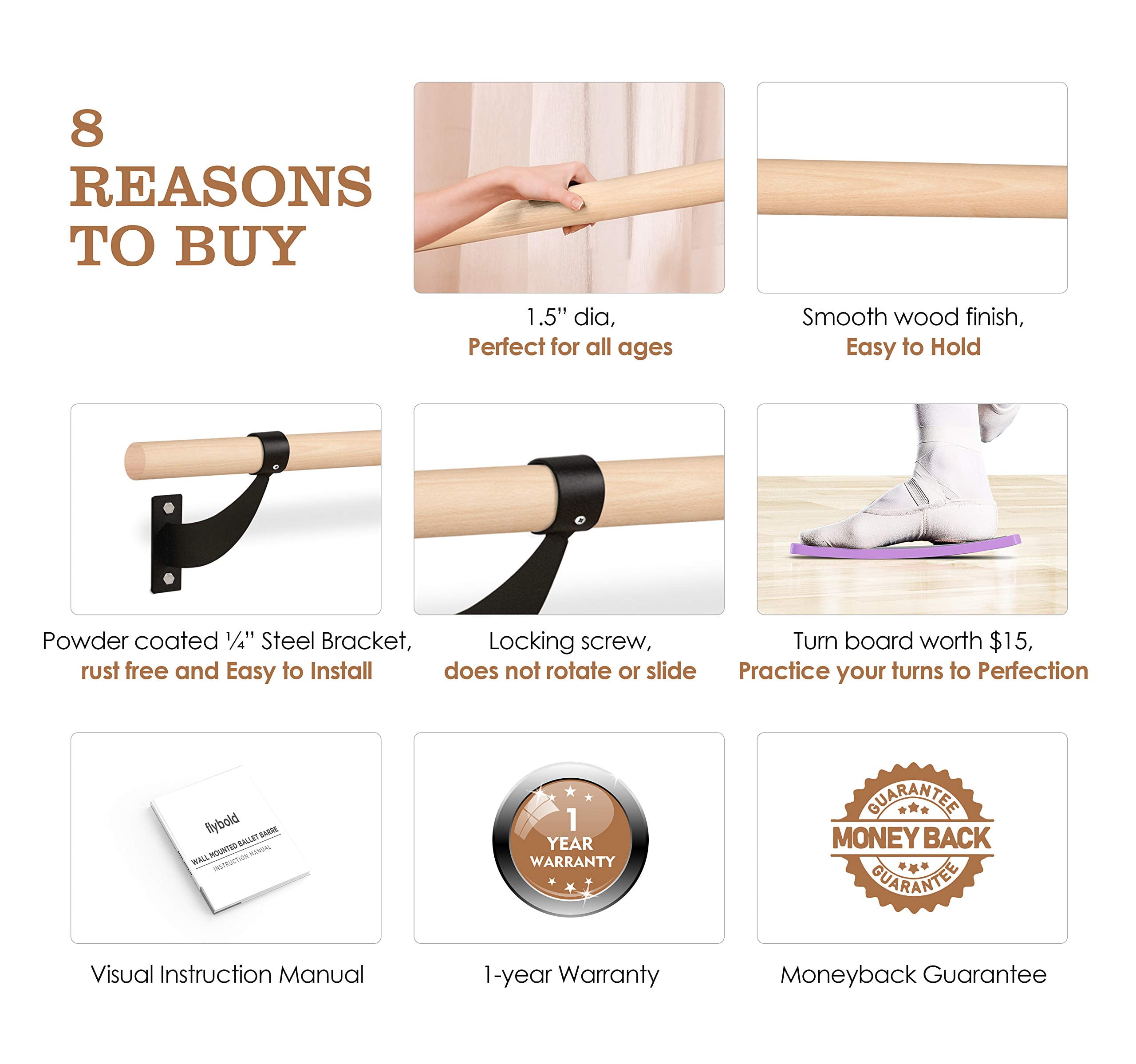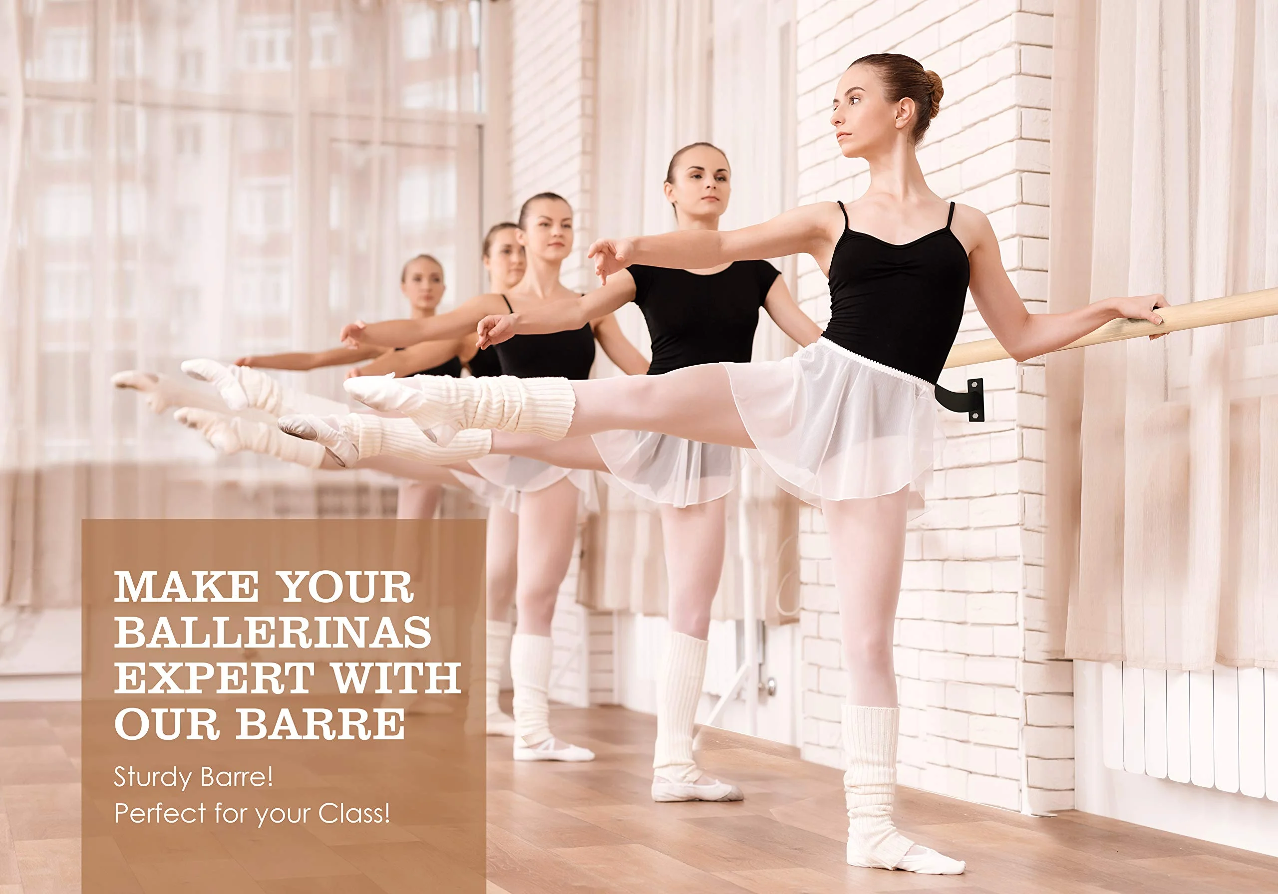 WE OFFER MORE THAN OTHER BARRE WORKOUT EQUIPMENT, FOR LESS! FEELS PERFECT for ballerina to hold at 1.5 dia, 4 feet long, smooth sanded premium beech wood with no splinters. NO WOBBLE NO SLIDE high tensile steel brackets and strong locking screws. Ballet barres mount includes TURNING BOARD worth 15. FEELS PERFECT TO HOLD Perfect your craft on a bar that DOESNT BEND and has NO SPLINTERS, thanks to the premium beech wood finish and SMOOTH SANDED surface. At 1.5 inch diameter and 4 feet length, this ballet equipment feels just right to clasp into your palm. Portable ballet barre for home! Also called as dance bars, baller NO, OUR BAR DOESNT WOBBLE OR SLIDE! Wobbling is a common problem with ballet bars. The ballet bar wall mount is designed to with high tensile powder coated steel brackets and strong locking screws. Your ballet bar doesnt wobble or slide while in use. INCLUDES A TURNING BOARD WORTH 15 Perfect your pirouette and master your spinning techniques with a turning board that comes included. Spin and balance safely on this board made of high grade plastic with an antiskid soft neoprene rubber base. MAKES A GREAT GIFT for dancers. The set is suitable for all kids, beginners, adults, girls, women for use at home, studio, gym floor, pilates, yoga for fitness, stretching, core strength training. In the unlikely event you arent delighted with the product, you can return for a full refund or replacement.