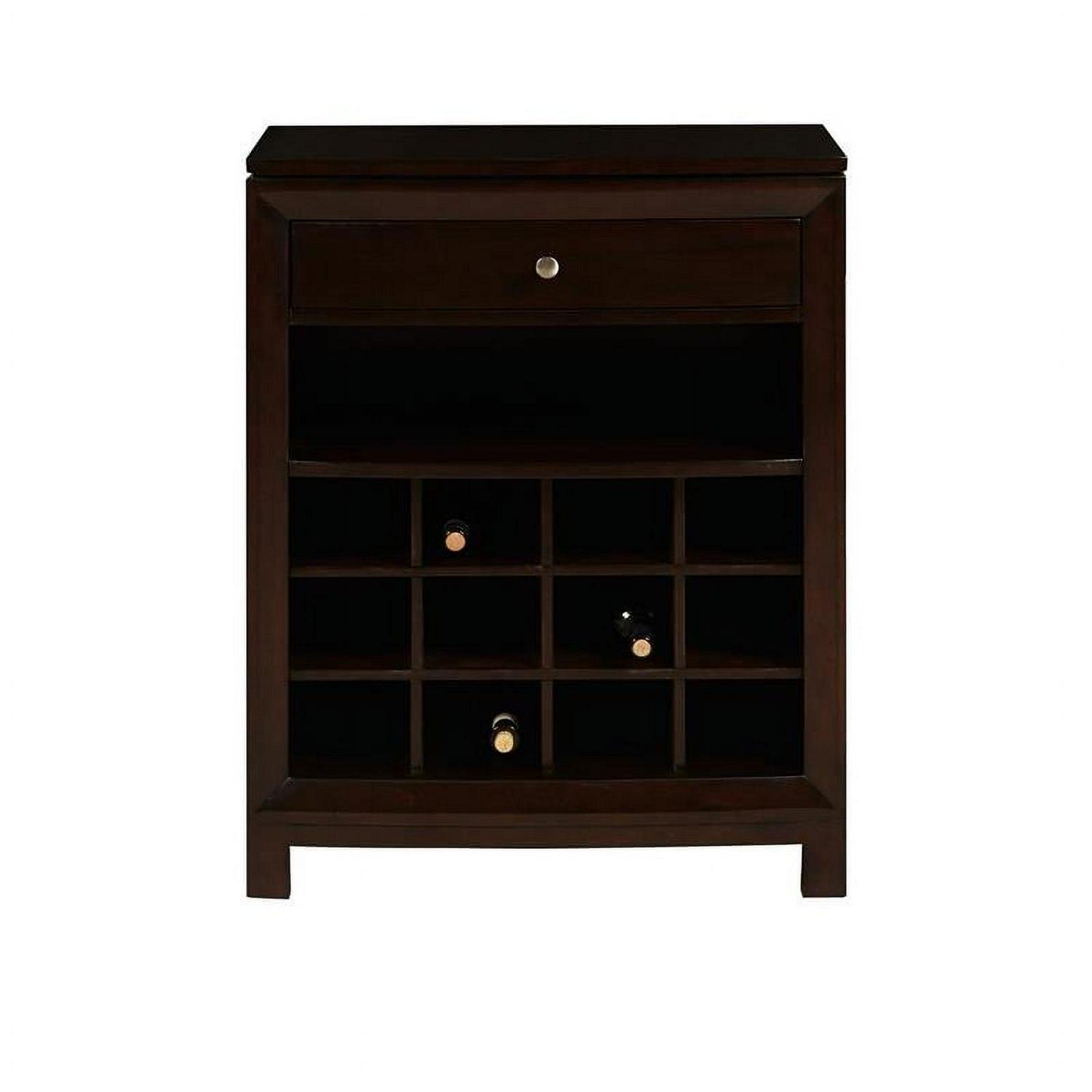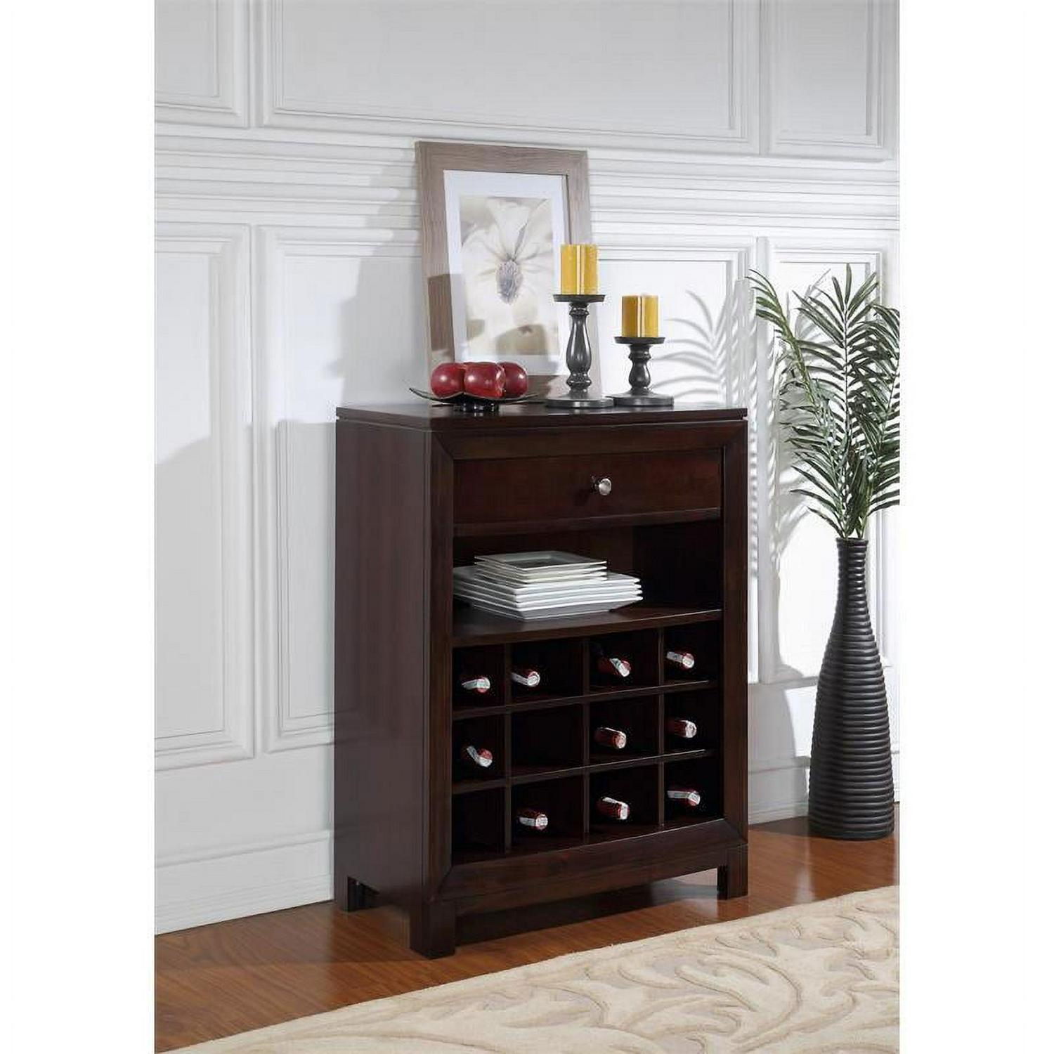Perfect for both the wine enthusiast and casual taster, this clean-lined modern wine cabinet holds up to 12 bottles in its lower rack. A drawer and a shelf provide storage for glasses, corkscrews, cocktail napkins and more, making it ideal for the bar, dining room, den or kitchen.