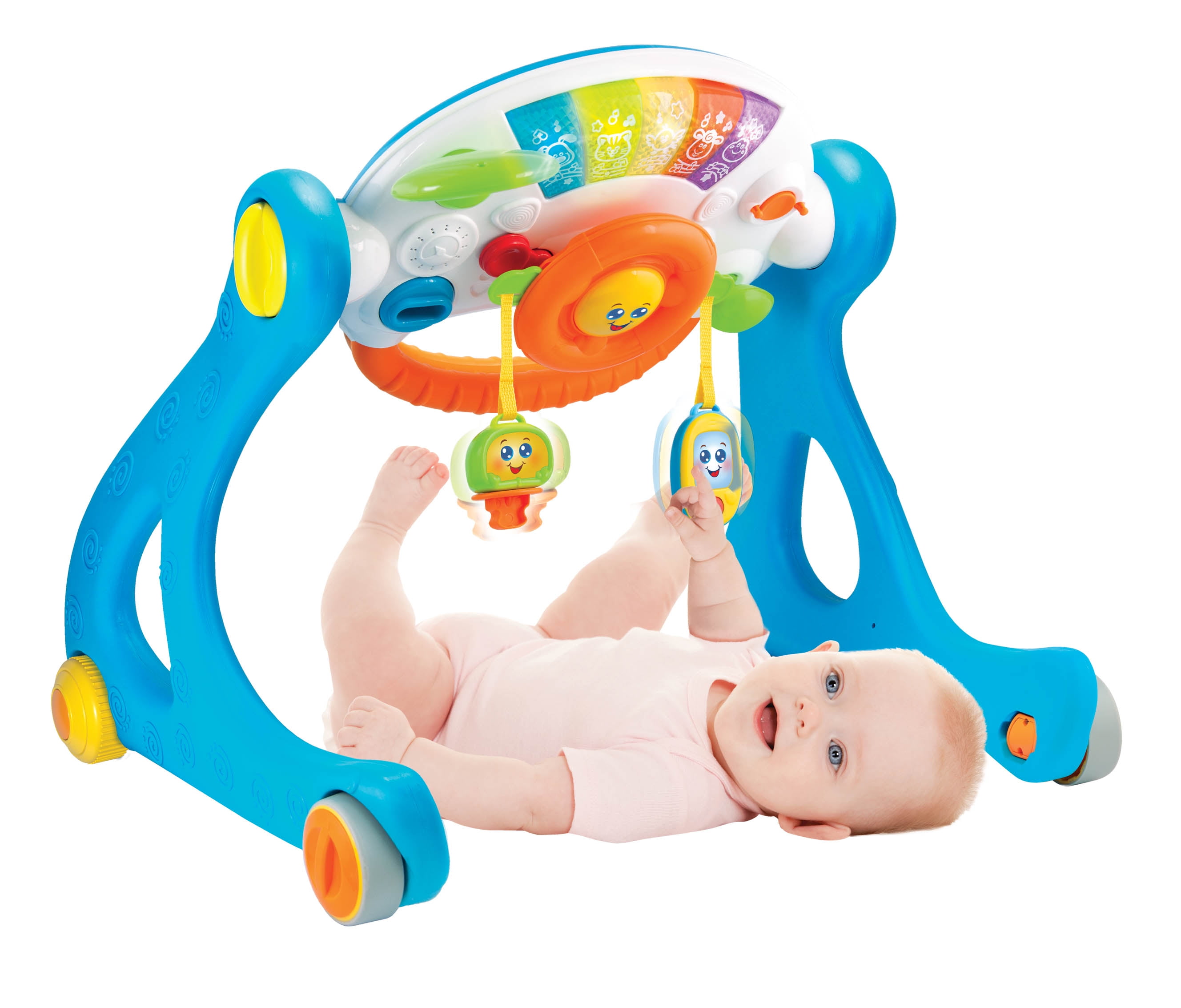 The Winfun Grow-with-Me Gym Walker includes Lay-and-Play Gym, Detachable Play Panel, Sit-to-Stand Dashboard and a Walker! The Adjustable Play Panel can be Angled to suit developing baby’s needs. The play panel includes, Horn, Gear Stick, Ignition Key, Turning Wheel, Baby-Safe Mirror and a 5 note Piano Keyboard! The 5 Note Keyboard has Flashing Lights and Fun Animal Sounds and Melodies! the Grow with me Gym is brightly colored in blues, whites, orange and green the bright colors will keep your infant interested. It has a CPS Parenting System of Stage 1: For Gross Motor Skills, Curiosity, Fine Motor Skills. The perfect Unisex Toy for any Birthday or Holiday Gift