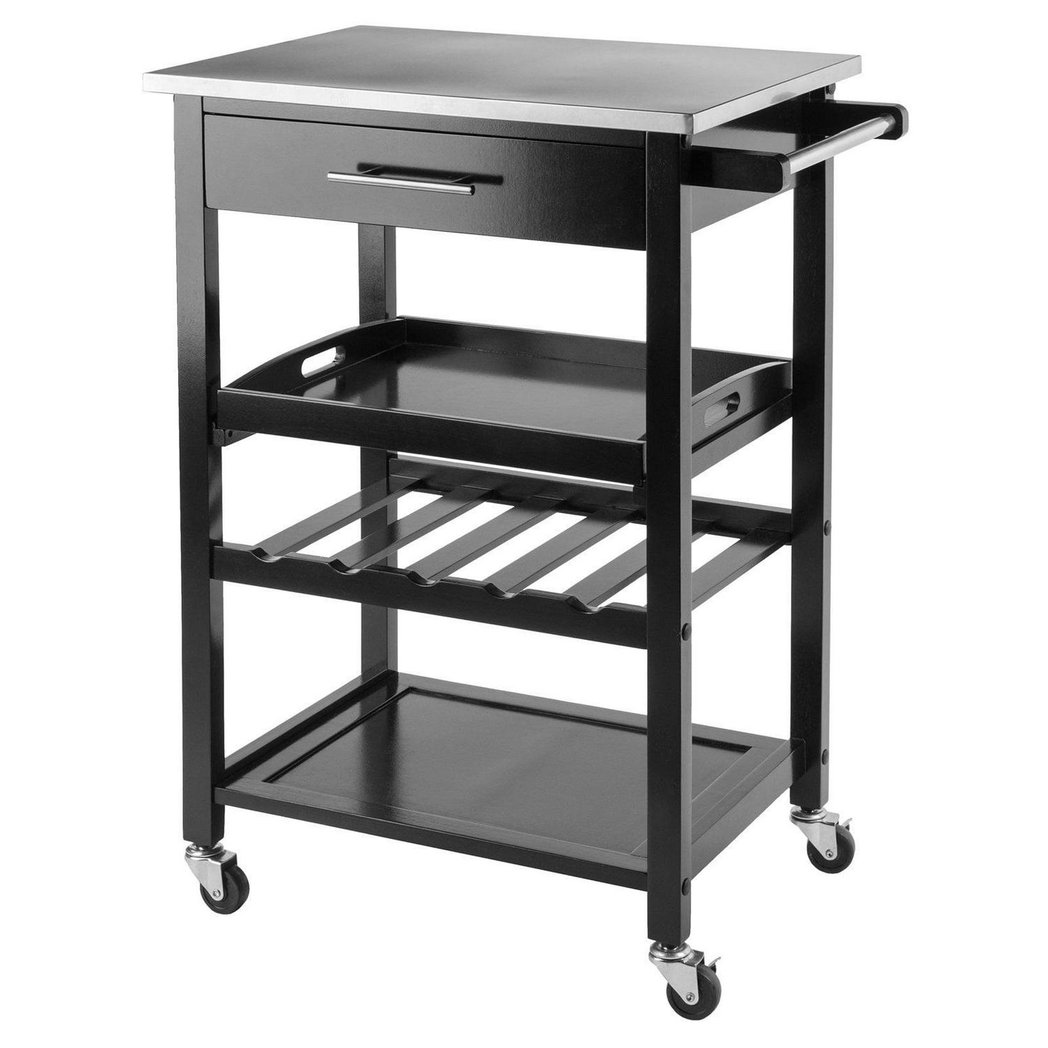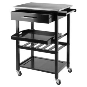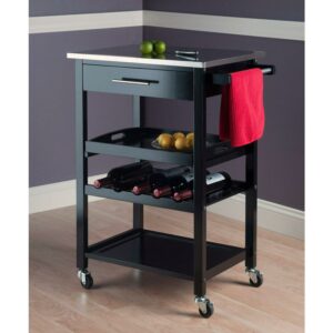 Details: The Anthony Kitchen Cart brings a modern and professional touch to your kitchen. The Stainless Steel top is the perfect; easy-to-clean cutting surface; and the cart frame and shelves are made of solid and composite wood. This remarkably functional cart has a removable serving tray with cut-out handles; ideal for carrying drinks and snacks. Store up to 5 bottles of wine on the rack below; and use the bottom shelf for additional storage or display. The easy-glide drawer is great for kitchen utensils or silverware; and the side handle can be used as a towel rack. The cart rolls easily on casters and has two locking wheels to keep the unit stable while in use. Finished in Stainless Steel and wood in Black finish. Overall dimensions are 33.75″H x 25.2″W x 16.8″D.