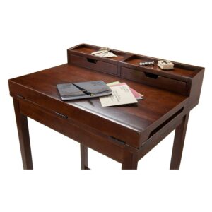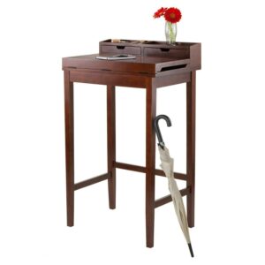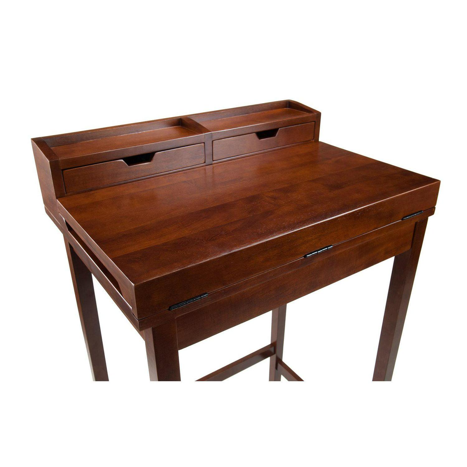 . Product Features: Elbow height can serve great as a reception desk or as a high work station . Ample amount of space under the desk. Generous workspace with a unique flip-open top for the extended surface. Multiple shelves, slots, and compartments add extra storage capacity for all your other necessities . Walnut finish computer desk is made with a combination of sturdy solid and composite wood. Assembly is required and is conveniently packed. . Dimensions: 45.9″H x 27.9″W x 19.9″D. Material(s): wood