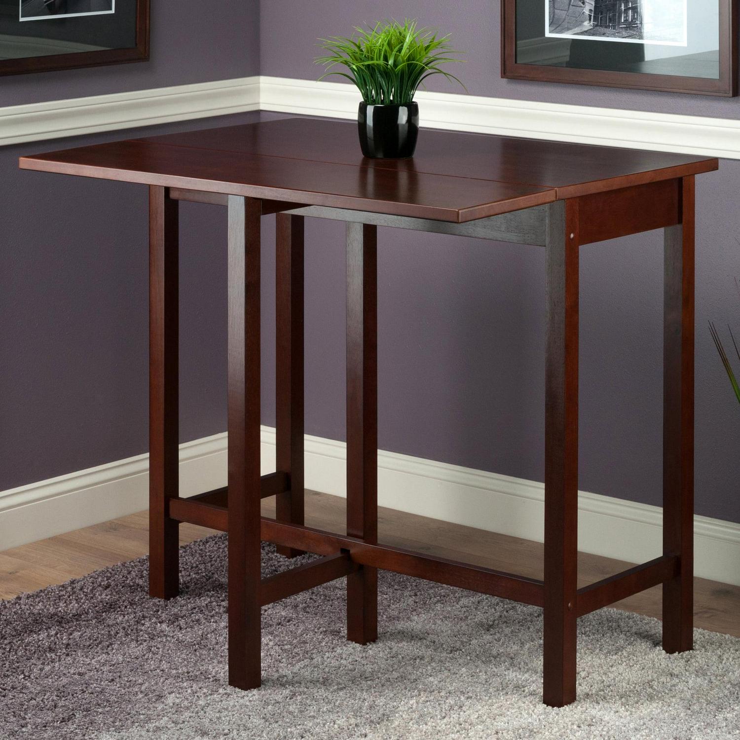 The Winsome Wood Lynnwood Drop-Leaf High Table is a simple design yet an indispensable addition to any home. Offering exceptional versatility and making this an excellent space saving choice for a studio apartment or small spaces where a multipurpose table is ideal. Needing more surface space, easily raise up the leaf and pull out the leg for support, accommodating up to 6 people. When guests are gone, for you daily living, bring down the leaf to help conserve valuable floor space. Complete your dining set with stools designed by Winsome Wood to create a more unified space (each sold separately). Constructed of sturdy solid wood for long lasting durability and finished in a rich walnut that will go well with just about any decor. Conveniently packed and shipped in 1 box, that includes the hardware necessary for assembling. Replacement part request can be submitted directly to the manufacturer within 60 days from date of purchase.