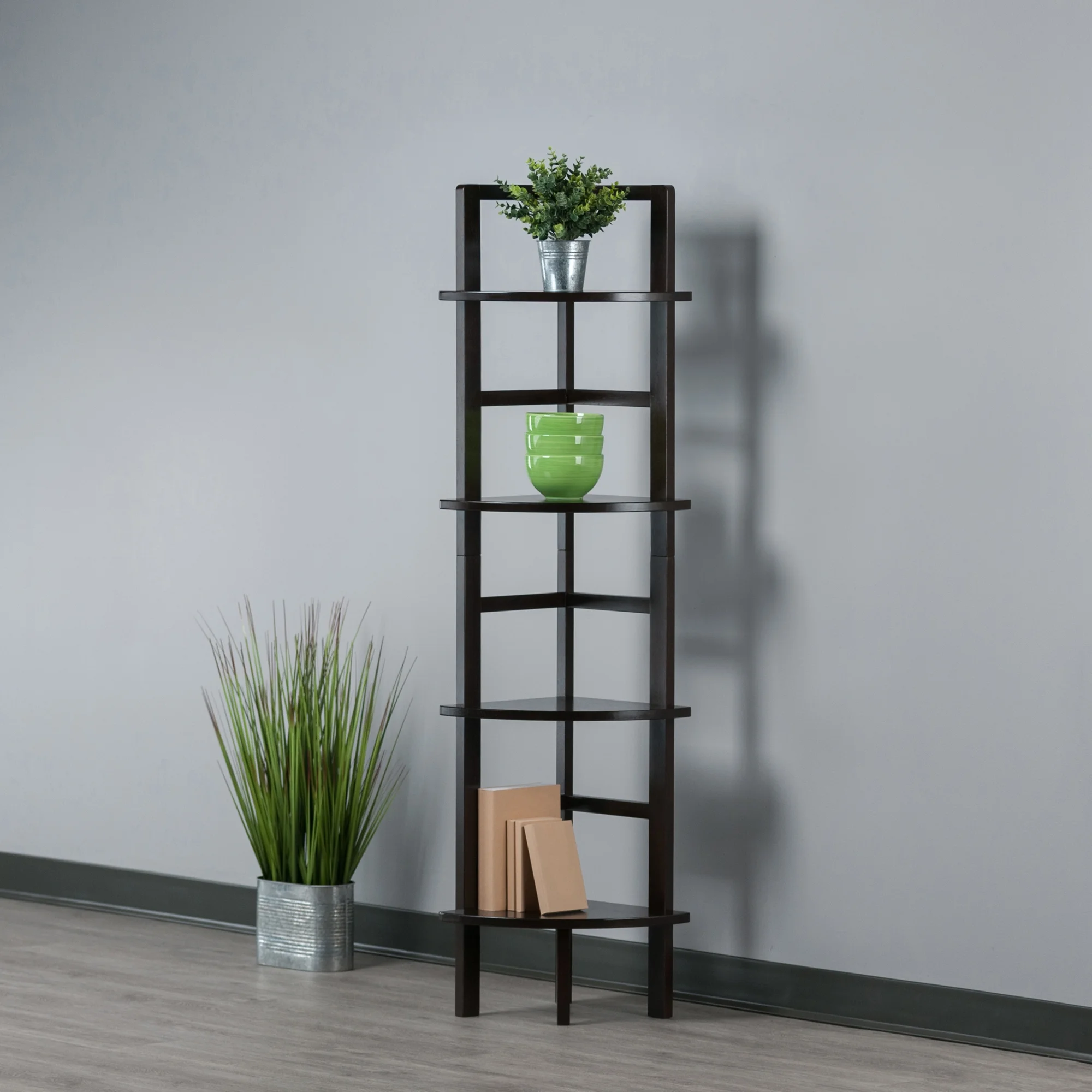 The Winsome Wood Aiden Corner Baker’s Rack combines the styling of an antique Tuscan baker’s rack with a contemporary shelving unit that’s perfect for unused corner spaces. Bring a touch of open-concept styling to your kitchen where the rack can keep a basket of fruit, mixing bowls, and a few bottles of wine. Or use it in the living room for books and framed photos, with your favorite plant adding flair. The rack also makes an ideal shelf unit in the bathroom for guest towels or decorative items. Made of solid wood, it has four shelves with plenty of clearance between shelves and an extra leg support for the bottom shelf. The 90° right angle fits neatly in any corner of your home. Finished in a rich coffee, this shelf unit will suit any decor. Shipped in one box with hardware needed for assembly.