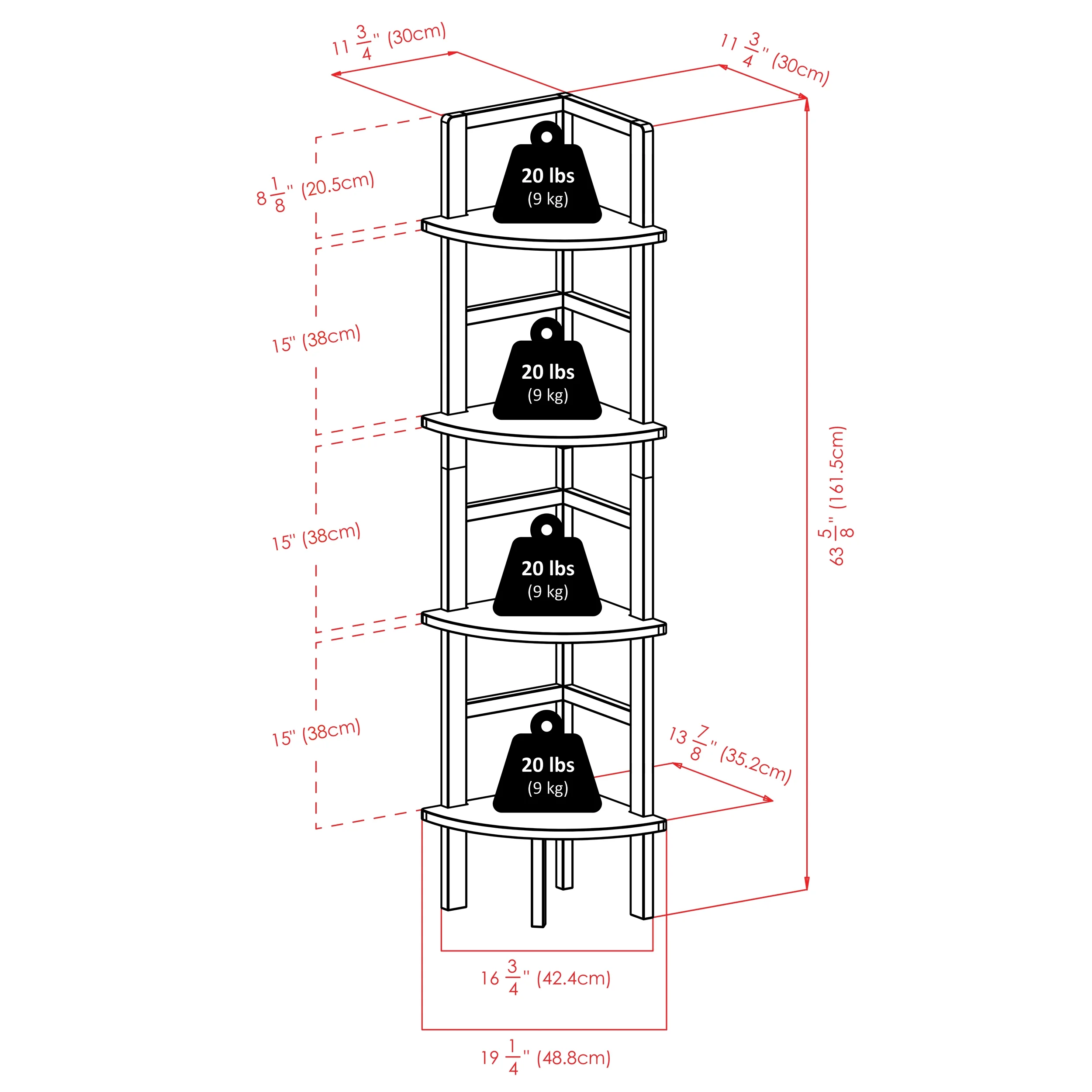 Winsome Wood Aiden Corner Baker’s Rack, Coffee: 4-Tier corner shelf Aiden collection Coffee finish Transitional style Assembled dimensions: 13.86″W x 13.86″D x 63.58″H Shelf depth: 12.91″ (center of quarter circle) Shelf width: 19.21″ (corner to corner) Shelf clearance: 14.96″H Ground clearance: 7.48″H Static weight capacity: 20lbs per shelf Constructed of solid wood Item weight: 20.94lbs Ships in 1 box Box dimensions: 38.25″L x 16″W x 5.25″H Shipping weight: 24.25lbs Assembly is required Model #23561
