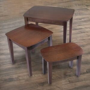 These Winsome Wood Bradley Nesting Tables combine contemporary design with a functional innovative look that will be a great addition to your home. This set of three nesting tables can be stacked and used together as a set or used individually in the same room or in different areas of your home. Its sleek surface is the perfect canvas for displaying an array of framed family photos in the living room or add this set to the den to complement a traditional arrangement. With its open base, this simply-chic set is a charming addition to your furniture collection. No matter what room you choose this set blends effortlessly into any casual aesthetic. Made up of remarkably sturdy solid wood for long lasting durability, in a walnut finish that brings out the warmth of the wood grain. Conveniently ships in 1 box and is ready for assembly. Replacement parts can be requested directly to the manufacturer within 60 days from date of purchase.