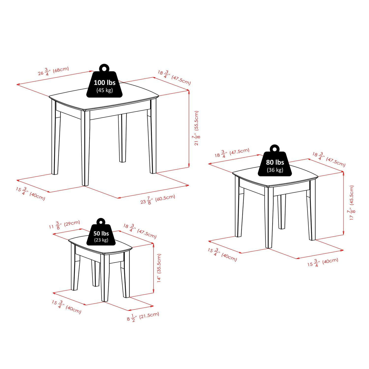 - Static weight capacity: largest table 100lbs, medium table 80lbs, smallest table 50lbs