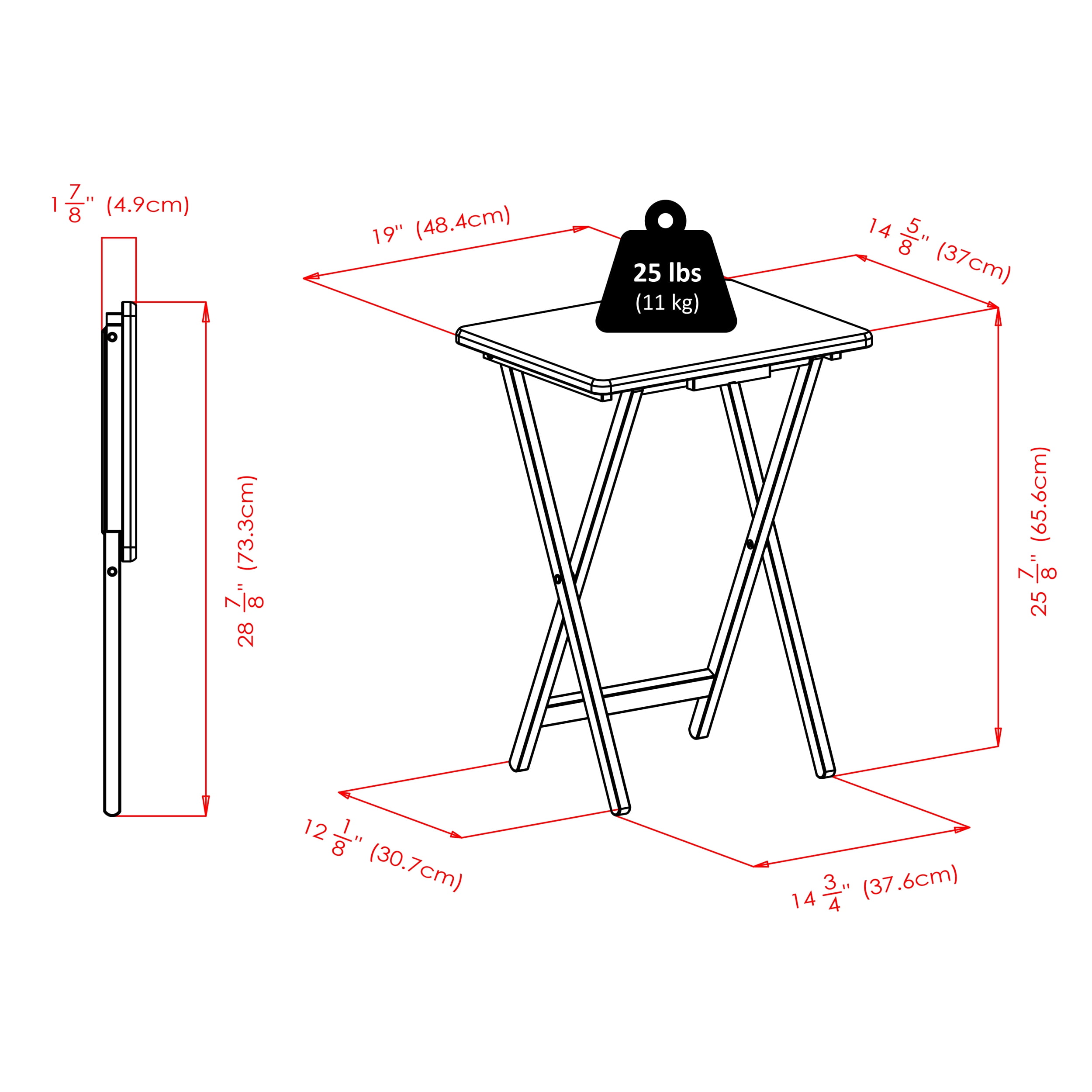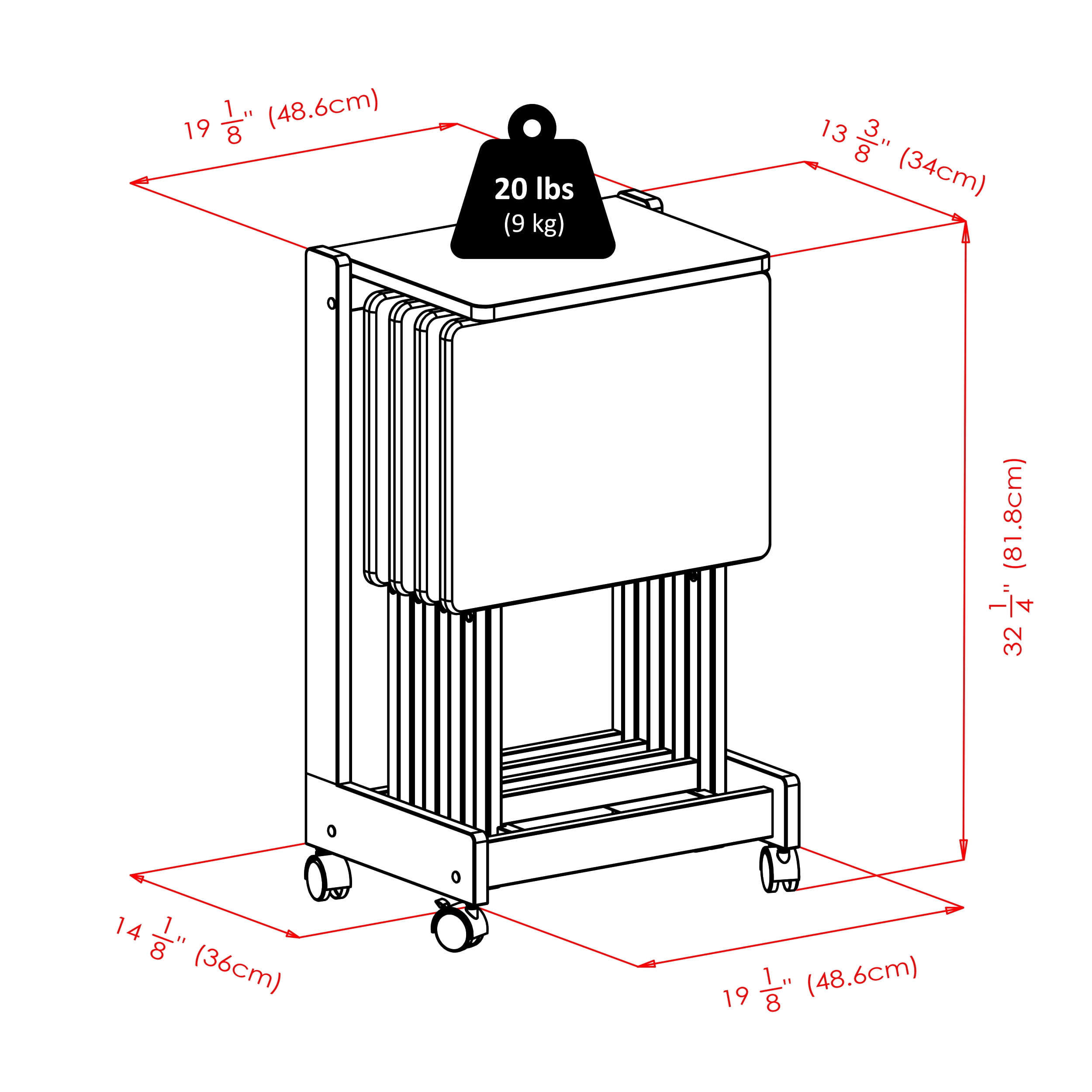 Winsome Wood Brienda 5-Pc Snack Table set, Serving Cart, Natural: Four foldable snack tables; mobile storage rack with flop top Brienda collection Natural finish Transitional style Assembled dimensions: 19.13″W x 14.17″W x 32.2″H Individual table (open) dimensions: 19.06″W x 14.57″D x 25.83″H Individual table (folded) dimensions: 19.06″W x 1.92″D x 28.87″H Flip top dimensions: 17.32″W x 13.39″D Static weight capacity; 20lbs flip top, 25lbs per table 4-Wheels (2 with locking mechanism) Constructed of solid wood Net weight: 33.75lbs tables, 13.45lbs storage rack Ships in 1 box Box dimensions: 31.75″L x 20.75″W x 7.50″H Shipping weight: 48lbs Assembly required for storage rack/stand only TV tables pre-assembled Model #83520