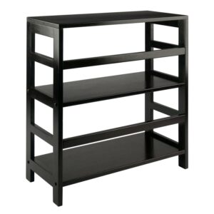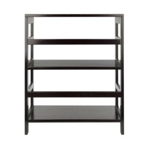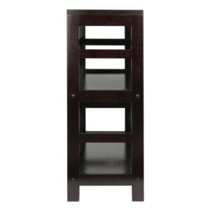 Combine extra storage space with the convenience of the versatile Winsome Wood Capri 5-Piece Storage Shelf. Great organizational shelf that includes 4 foldable baskets to help keep any room tidy. Finished in a rich espresso and made of solid wood for long-lasting durability. The set of baskets are made up of beige fabric with front and back handles for carrying purposes and can hold up to 15lbs (evenly distributed). Prompt up and these baskets are 10.06 W x 10.97 D x 9 H. This set is shipped in two boxes. The shelf will ship separately and will include the hardware necessary for assembly.