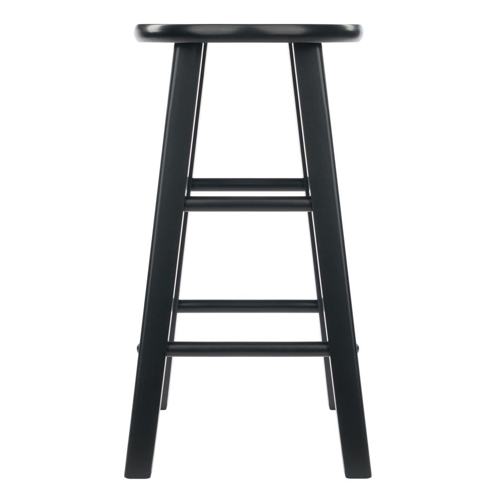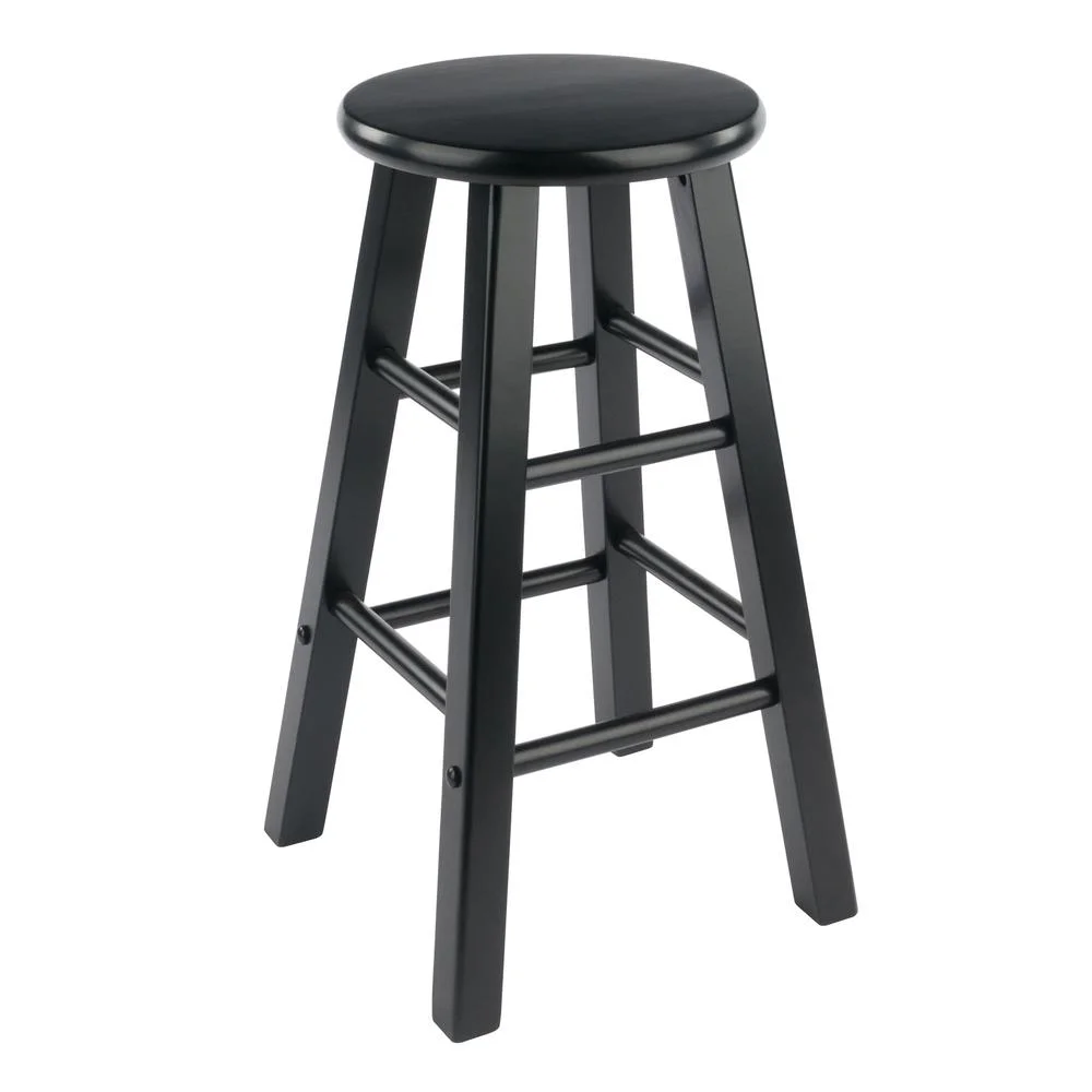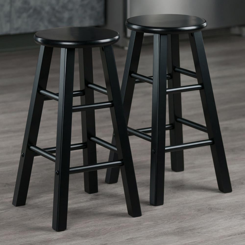 Spruce up your kitchen, breakfast nook, or den with this Winsome Element Counter Stool Set. Finished in a polished black finish, these stools feature simplicity of design blending seamlessly with any decor from modern to traditional. They feature a more conservative foot print than many other flared-leg stools which give them a streamlined, contemporary look and allow them to be tucked neatly underneath a counter or table. At nearly 24″ high these stools have a static weight of 220lbs. Crafted of solid wood, these stools have both high and low crossbars on all sides which provides stability while also serving as convenient footrests. The round seat is 12″ in diameter, offering a generous seating area. The 2-piece set conveniently ships in one box that includes the hardware needed for assembly.