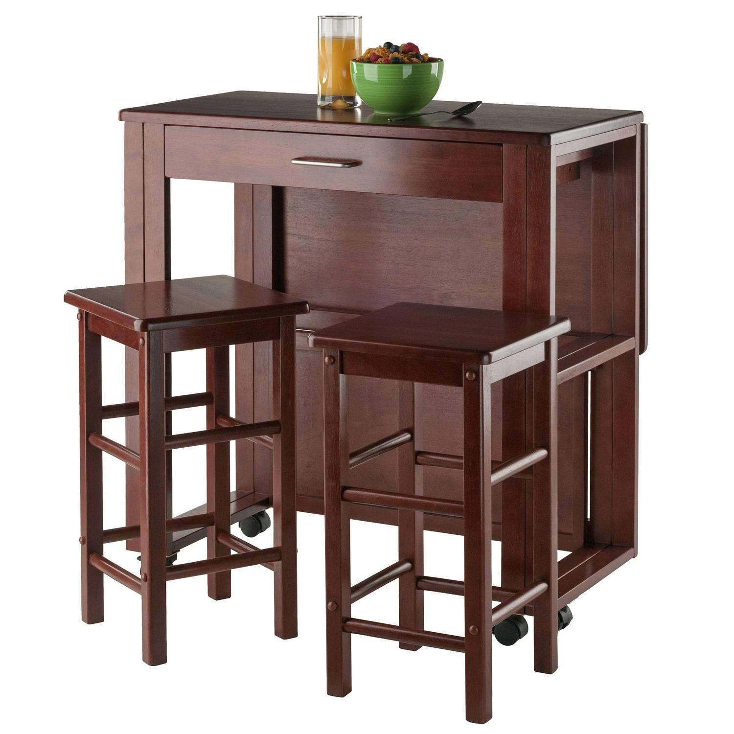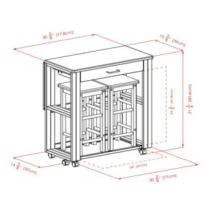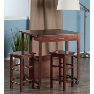 Add convenience and charm to your kitchen or breakfast nook with the Winsome Wood Fremont 3-piece Space Saver Set. Extend the drop-leaf top that is supported by two pull-out side panels, for extra workspace or to create a dining table for two. This cart is a must have for small spaces that need versatility. Two stools that can be placed on the bottom shelf allowing for both table and stools to be rolled as one unit. Or raise the bottom shelf to create even more leg room when sitting at the table all while still having plenty room to tuck both stools underneath the table. Lower the drop leaf for a more compact piece that can be placed against the wall and double as a console or serving table. For easy mobility, this table has six rolling casters, two of which lock to keep table in place. Store silverware and napkins in the table-wide drawer which makes it convenient to have within easy reach. Functionality paired with modernity, this versatile table is constructed of sturdy solid wood with some composite and finished in a rich walnut with a sleek drawer-pull in a silver finish. Conveniently ships in 1 box and ready for assembly.