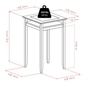 Entertain your guests around this sleek pub table accented with tempered glass providing a clear view to the shelf below. This unique configuration is functional as a display case or even storage for handbags and small accessories. Its long elegant legs lightly holds up the table with it’s slight curved end. 2 V-Back Chairs complete the set with their elegant design and smooth curved legs. Top Dimensions is 25.6″W x 25.6″D. Shelf is 20.1″~22.5″W x 20.1″~22.5″D. Shelf clearance is 3.2″H. Distance between legs is 20.1″ and the height from the bottom shelf to floor is 25.5″. Chair seat dimension 16.6″W x 15.6″D. Back rest dimension 17″W x 12.2″D. Seat height is 30″. Static weight capacity is 220lbs. The table is made of solid wood with the glass panel and comes in a walnut finish. Assembly required.