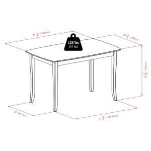 The Winsome Wood Inglewood Dining Table is a stunning blend of grace and simplicity. The tabletop has a softly curved profile supported by a solid frame. The contoured, cabriole legs give the table a refined design that will mesh effortlessly in your dining room or kitchen nook. Simple yet attractive and versatile for its oblong shape and size. An ideal table for studio apartments or smaller eating areas, comfortably accommodating a group of four. This Inglewood table will combine great with several of the Winsome Wood dining chairs (each sold separately). Generous height clearance from floor to aprons at 25.59 H, that allows for dining chairs of any style. Finished in a warm walnut, this table is made up of remarkably sturdy solid wood for long lasting durability. Conveniently ships in 1 box and ready for assembly. Replacement parts can be requested directly to the manufacturer within 60 days from date of purchase.