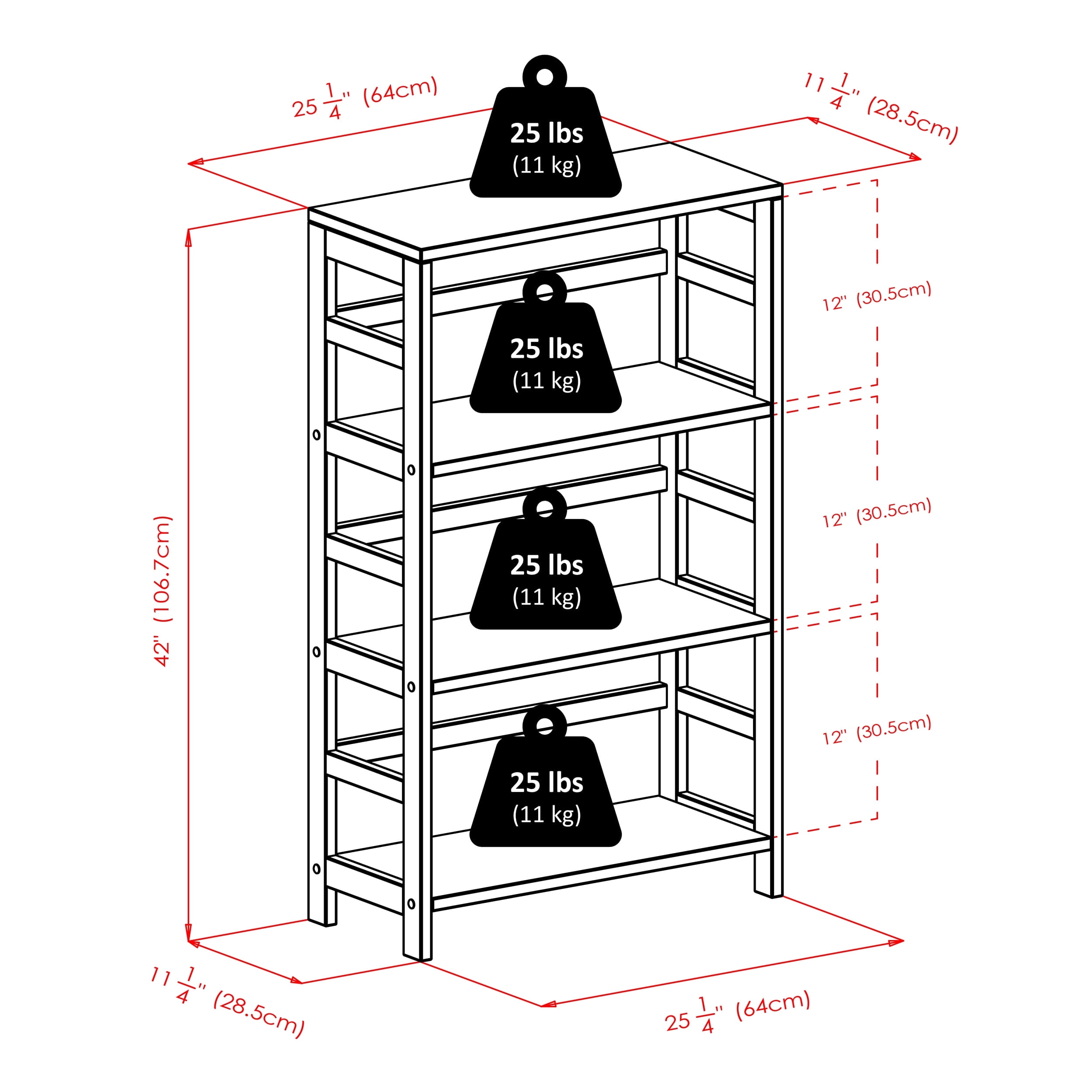Leo Storage Open Shelf, 3-Section, Wide, Espresso: Dimensions of assembled shelf: 25.20″W x 11.22″D x 42″H Clearance between each shelf: 12″ Shelf surface: 23.62″W x 11.14″D Leo 3-section wood open shelf is made from solid and composite wood Espresso finish Assembly required 60-day limited warranty Wide 4-tier storage shelf Three sections designed to hold the espresso large storage basket or 2 small storage baskets (sold separately) Mix and match with the other espresso storage shelves, both narrow and wide (sold separately)