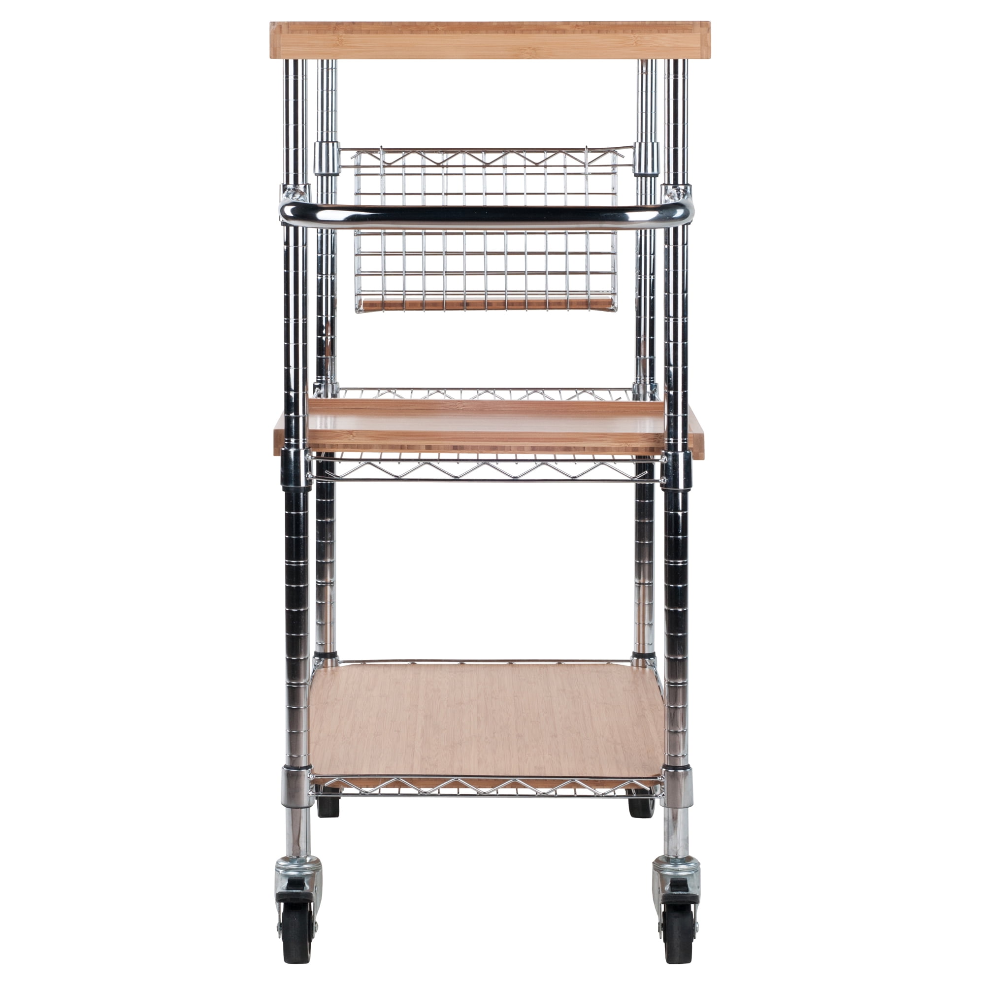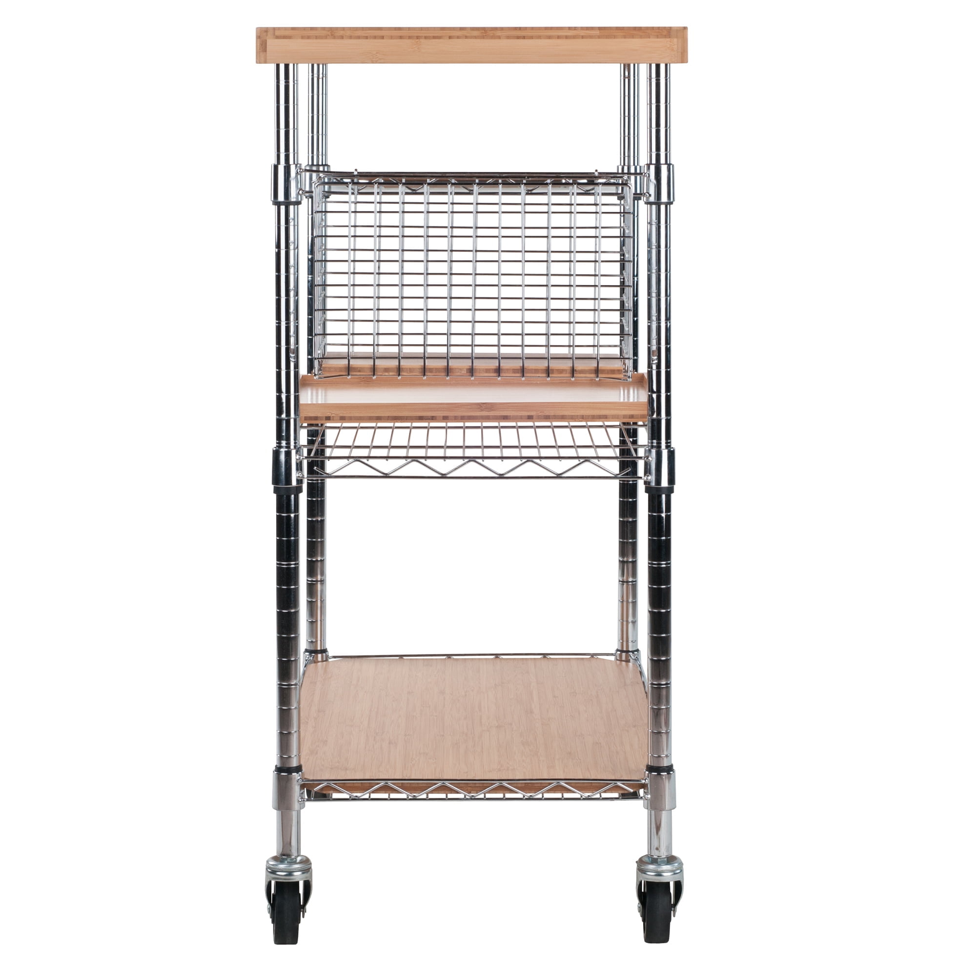 Crisp and clean, the Winsome Wood Madera Utility Kitchen Cart will serve you well whenever and wherever you want to expand your entertaining workplace. This cart features adjustable set-up heights on the shelves, caddy, and even the handle, so you can best position each to suit your needs. Chop vegetables and prepare appetizers on the natural bamboo cutting board top, while keeping utensils or bottles of wine in the caddy. The sturdy metal along with a removable serving tray can be used to store glassware, bottles, and bowls. The top surface, lower shelf, caddy insert, and the serving tray are made of natural bamboo. The frame, shelves, and basket are constructed of smooth chrome metal for a bright look. The four casters allow for easy mobility, roll out to the dining area, and use as a serving cart. Two of the casters lock to help keep the unit stable while in use. This cart is a must have for small spaces that need versatility. Conveniently packed and shipped in 1 box that includes the hardware necessary for assembling.