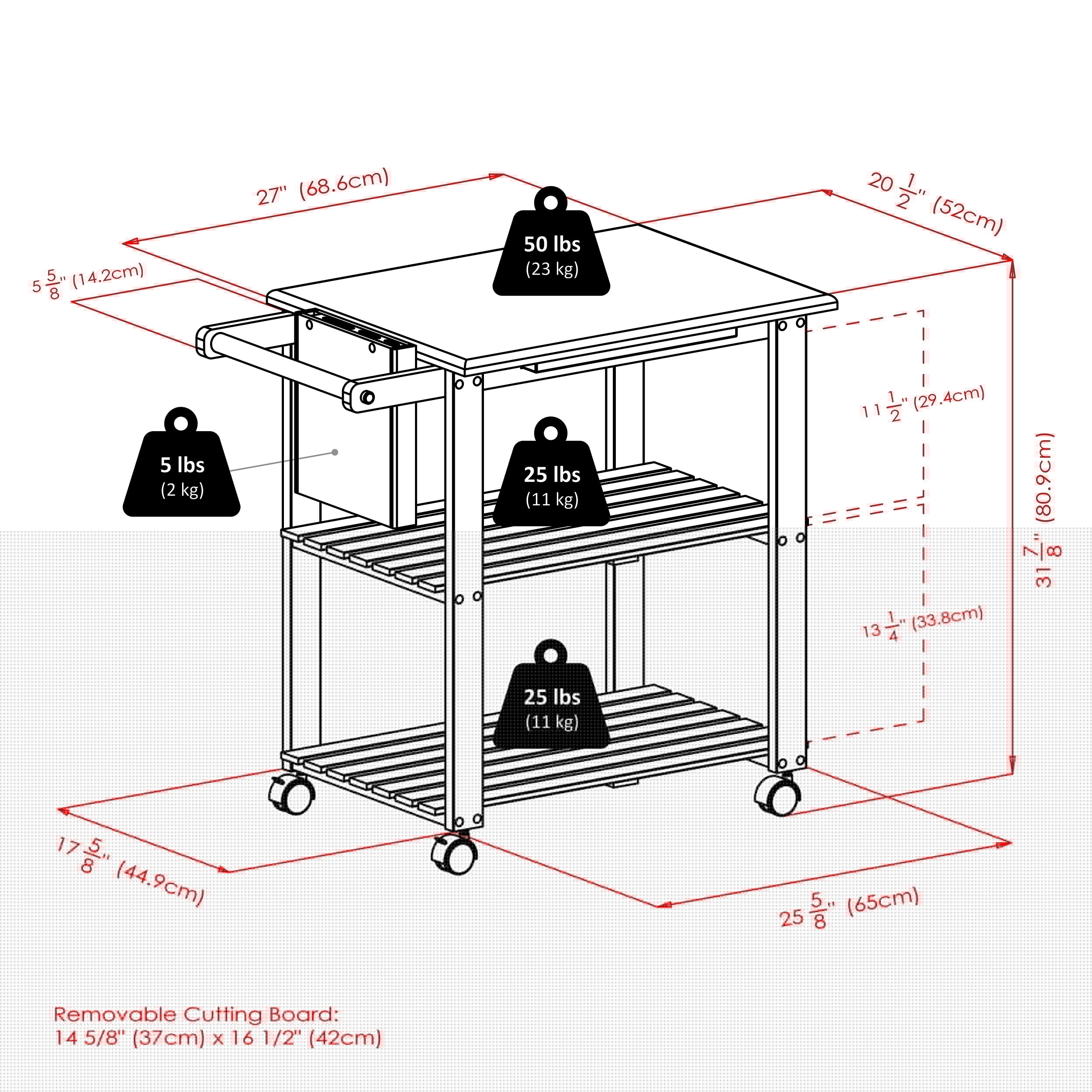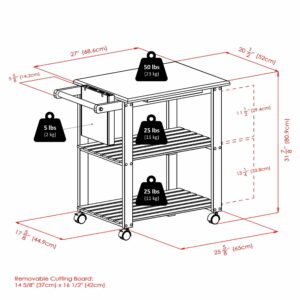 Includes cutting board, knife holders, 2 shelves, holder for cloth or dish towel, casters.