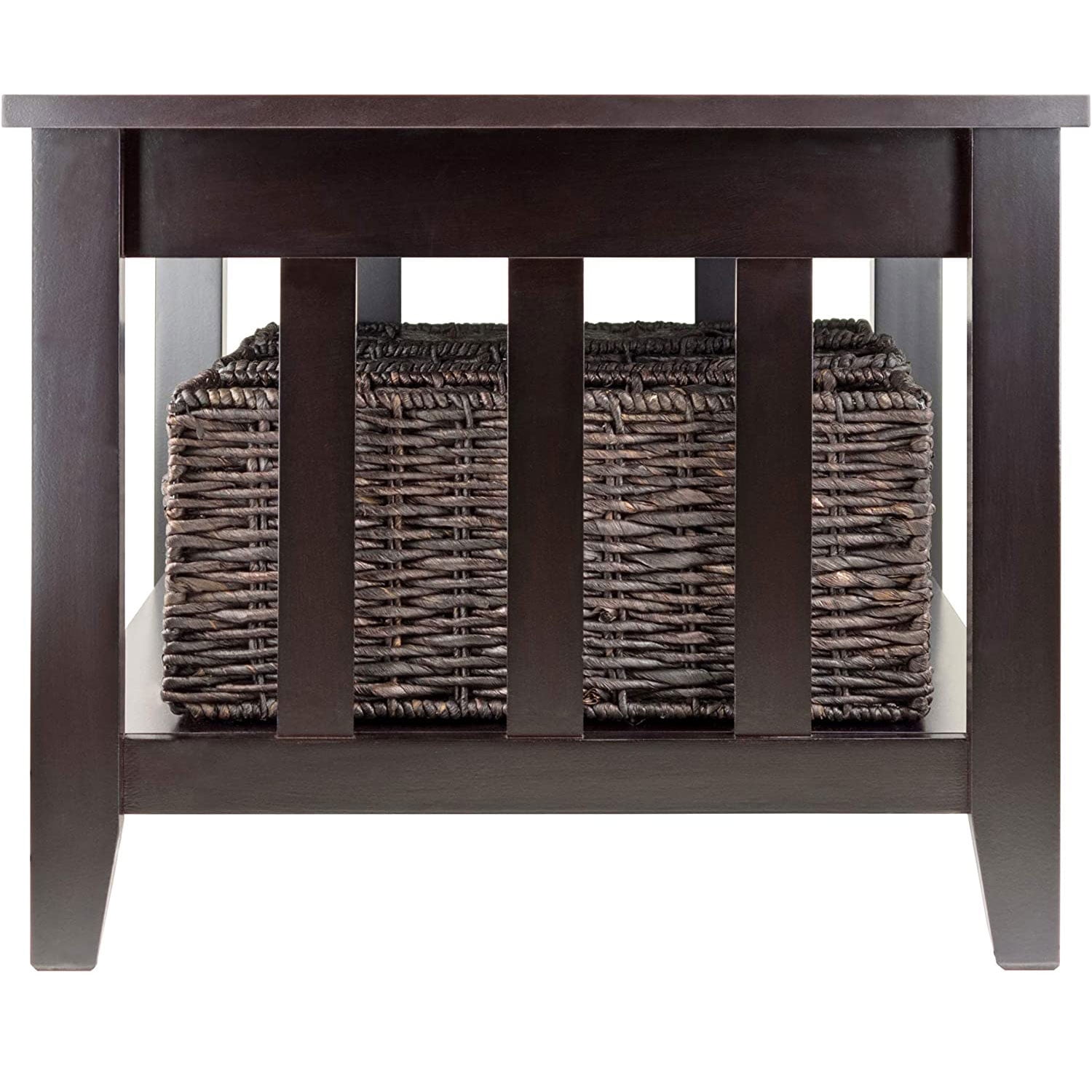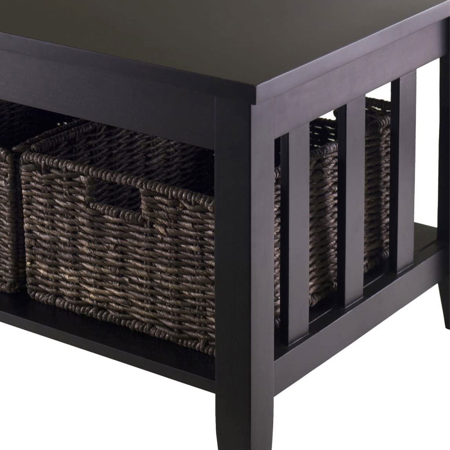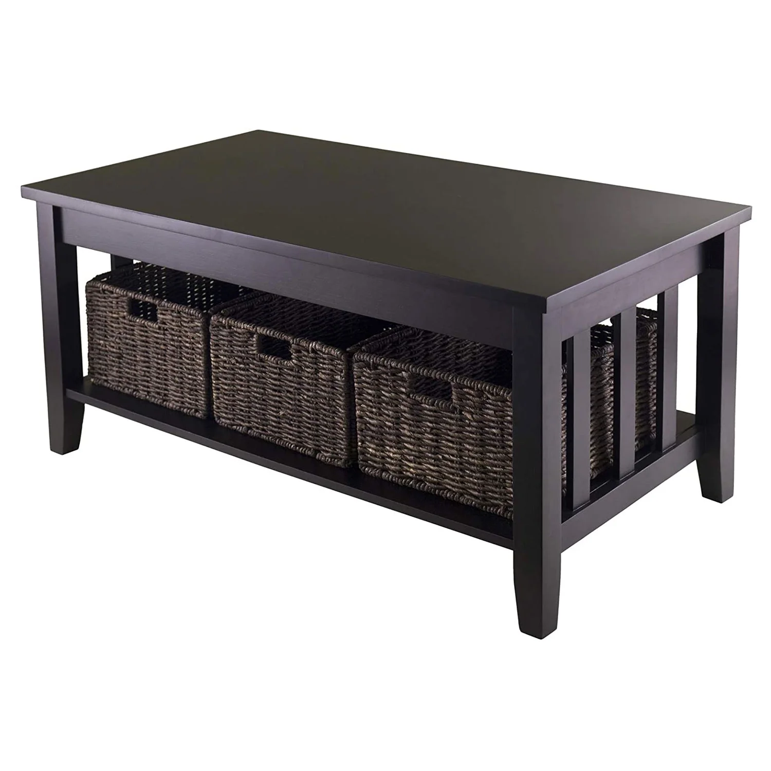 The Winsome Wood Morris Coffee Table provides accentual contemporary storage to your home with a simple clean design. Finished in a rich espresso, this table features an open shelf with slatted side panels. Great addition to the center of your living space as a display table all while conserving space. You can now enjoy a refreshing cup of coffee with your friends and family as you gather in your family room. This table provides ample tabletop and plenty of storage to help you keep organized. Includes a set of 3 corn husk baskets in a chocolate tone that is perfect for storing books, games, or other daily use items. Crafted from solid and composite wood, this table is truly a durable piece of furniture. Assembly is required for the table while the baskets are shipped folded but are ready to use by prompting up. Conveniently packed and shipped in 1 box.
