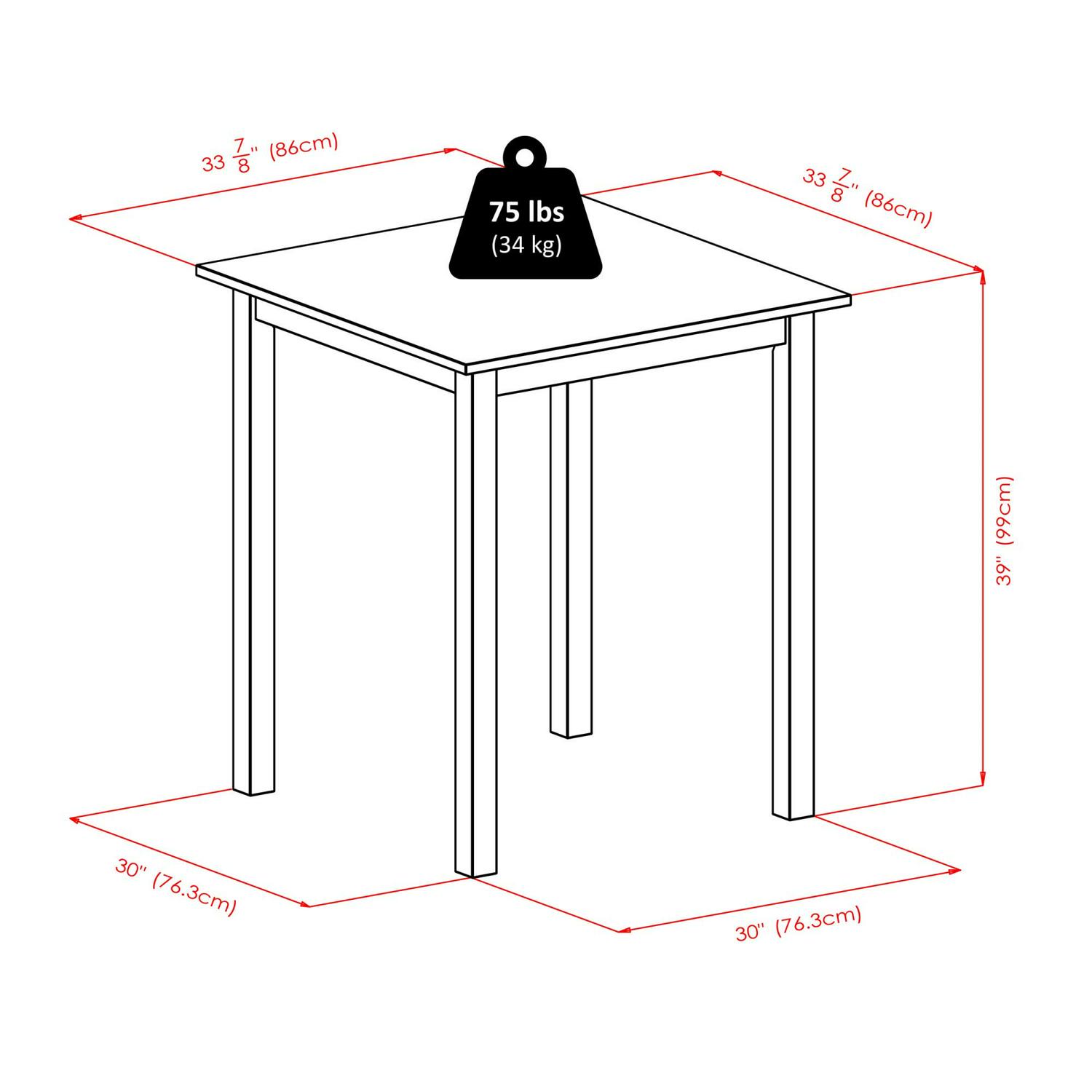 - Table dimensions: 33.86L x 33.86W x 38.9H inches