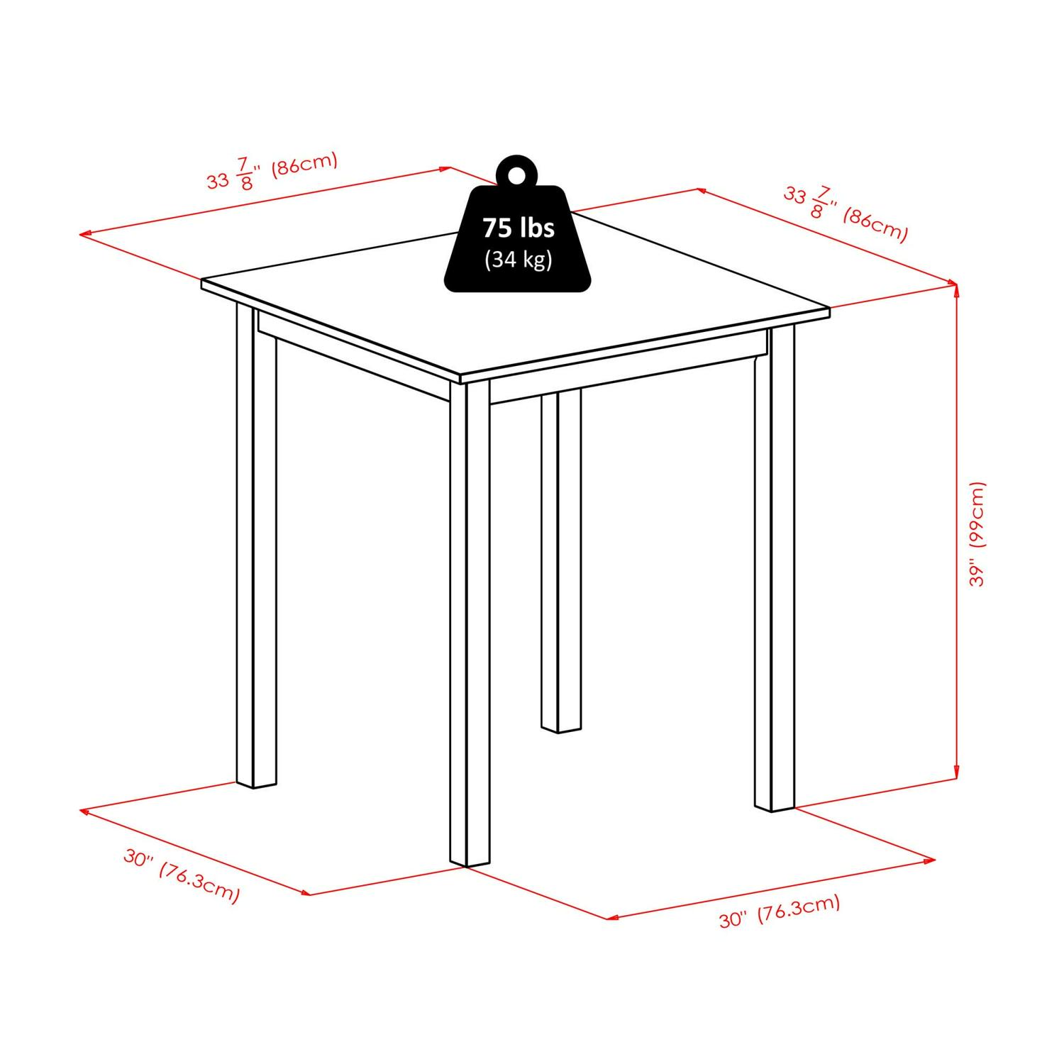 – Square Table assembled size is 33.86″W x 33.86″D x 38.98″H.