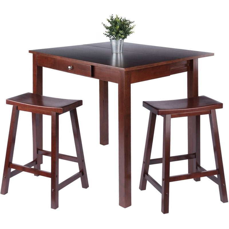 Take home a blend of grace and simplicity with the Winsome Wood Perrone High Table Set, an indispensable addition to any home. Offering exceptional versatility and making this an excellent space saving choice for a studio apartment or small spaces where a multipurpose table is ideal. Needing more surface space, this unique design offers the utmost in stability for expanding the table size. Pull out the apron, and the legs support the drop leaf when open, slide the apron back when the drop leaf is folded. With the leaf extended, the table seats four comfortably but for daily living keep the drop leaf down and conserve valuable floor space. A center drawer with a satin nickel finish knob keeps pens, pads, and other smaller items within easy reach. This table set is paired with two classically designed stools that are a perfect complement to the table. The 24″ counter stools have a unique saddle-shaped seat, which is extra-long, rectangular in shape, and curved in the middle for true comfort. Featuring a crossbar on all four sides, for stability and comfort making these stools not only attractive but also very functional. Enjoy this set for casual dining or use the table as a console or convenient place to work on your laptop. Constructed of sturdy solid wood for long lasting durability and finished in a rich walnut, this set can be incorporated effortlessly into nearly any existing decor. Ships in 3 boxes that include the hardware necessary for assembling. Replacement part request can be submitted directly to the manufacturer within 60 days from date of purchase. Overall table dimensions: 29.1″H x 40″W x 34.8″D (with leaf extended) 29.1″H x 40″W x 21.6″D (with leaf closed) – leaf dimension is 40″W x 14″D Inside drawer dimensions: 12.1″W x 8.9″D x 2″H Clearance underneath table (Front): 24.8″H x 34.1″W Clearance underneath table (Side): 24.8″H x 14.2″W Stool assembled size is 17.4″W x 14.47″D x 24″H Seat Dimension is 17.5″W x 9″D – Static Weight limit 220 Lbs. Assembly required Ships in 3 boxes