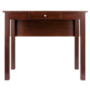 Take home a blend of grace and simplicity with the Winsome Wood Perrone Height Table with Drop Leaf Dining Table, an indispensable addition to any home. Offering exceptional versatility and making this an excellent space saving choice for a studio apartment or small spaces where a multipurpose table is ideal. Needing more surface space, this unique design offers the utmost in stability for expanding the table size. Pull out the back apron, and the legs slide out to support the drop leaf when open. Slide the apron and legs back when the drop leaf is folded back down. With the leaf extended, the table seats four comfortably with leg space for everyone. Or with leaf folded down, pull up a couple of counter stools and enjoy a casual meal for two. A center drawer with a satin nickel finish knob keeps small but necessary must have s handy and within easy reach. With the leaf down, this table can also be used as a console or convenient place to work on your laptop. Complete your set with stools designed by Winsome Wood to create a more unified space (each sold separately). Constructed of sturdy solid wood frame with a wood veneer table top for long lasting durability and finished in a gleaming walnut that will go well with just about any decor. Replacement part request can be submitted directly to the manufacturer within 60 days from date of purchase. Overall dimensions: 29. 1″H x 40″W x 34. 8″D (with leaf extended) 29. 1″H x 40″W x 21. 6″D (with leaf closed) – leaf dimension is 40″W x 14″D Inside drawer dimensions: 12. 1″W x 8. 9″D x 2″H Clearance underneath table (Front): 24. 8″H x 34. 1″W Clearance underneath table (Side): 24. 8″H x 14. 2″W Assembly required