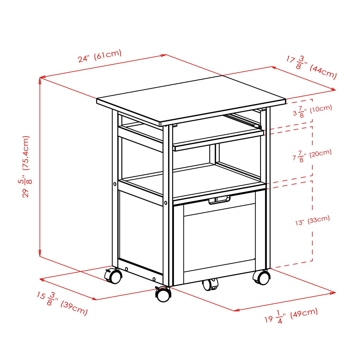 The Winsome Wood Piper Work Station embraces productivity and flexibility. This compact workstation is a multipurpose solution with storage for those needing a discreet unit. Sitting on five casters for easy mobility when needing to move for one spot to another. A pullout tray that can be used as a laptop stand, easily glides in and out for convenience. Store printing paper, office essentials like over-sized items on the open shelf for easy access. Important papers are easily organized in the versatile pullout drawer which can be used as a filing cabinet or general storage. Filing drawer can hold up to letter size folders with a distance of 12.2″ between metal rods and a 10.2″ distance from the rod to bottom of drawer. Constructed of a combination of solid and composite wood in a warmwalnut finish. This item is conveniently packed and shipped in 1 box, that includes the hardware necessary for assembling.