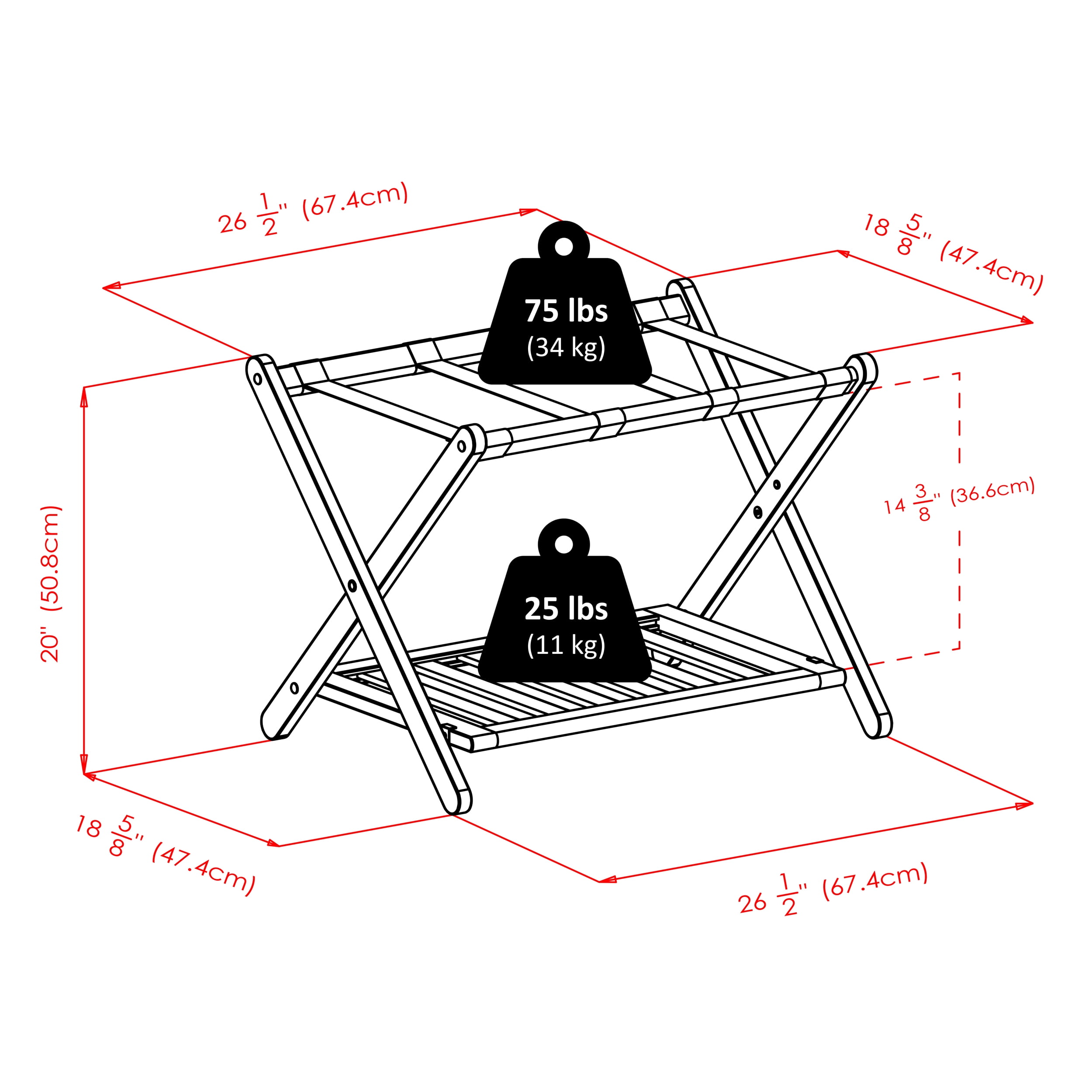 Luggage rack with shelf by Winsome Remy collection Solid wood in cappuccino finish 4-Black nylon straps Transitional style Overall dimensions: 26.54″W x 18.66″D x 20”H Folded dimensions: 26.54”W x 2.89”D x 26.70”H Foldable for compact storage Slatted bottom shelf Shelf dimensions: 22.91”W x 15.75”D Top weight capacity: 75lbs Shelf weight capacity: 25lbs Net weight: 8.20lbs Ships in 1 box Box dimensions: 29”L x 28”W x 4”H Shipping weight: 11lbs No assembly required Model #40436