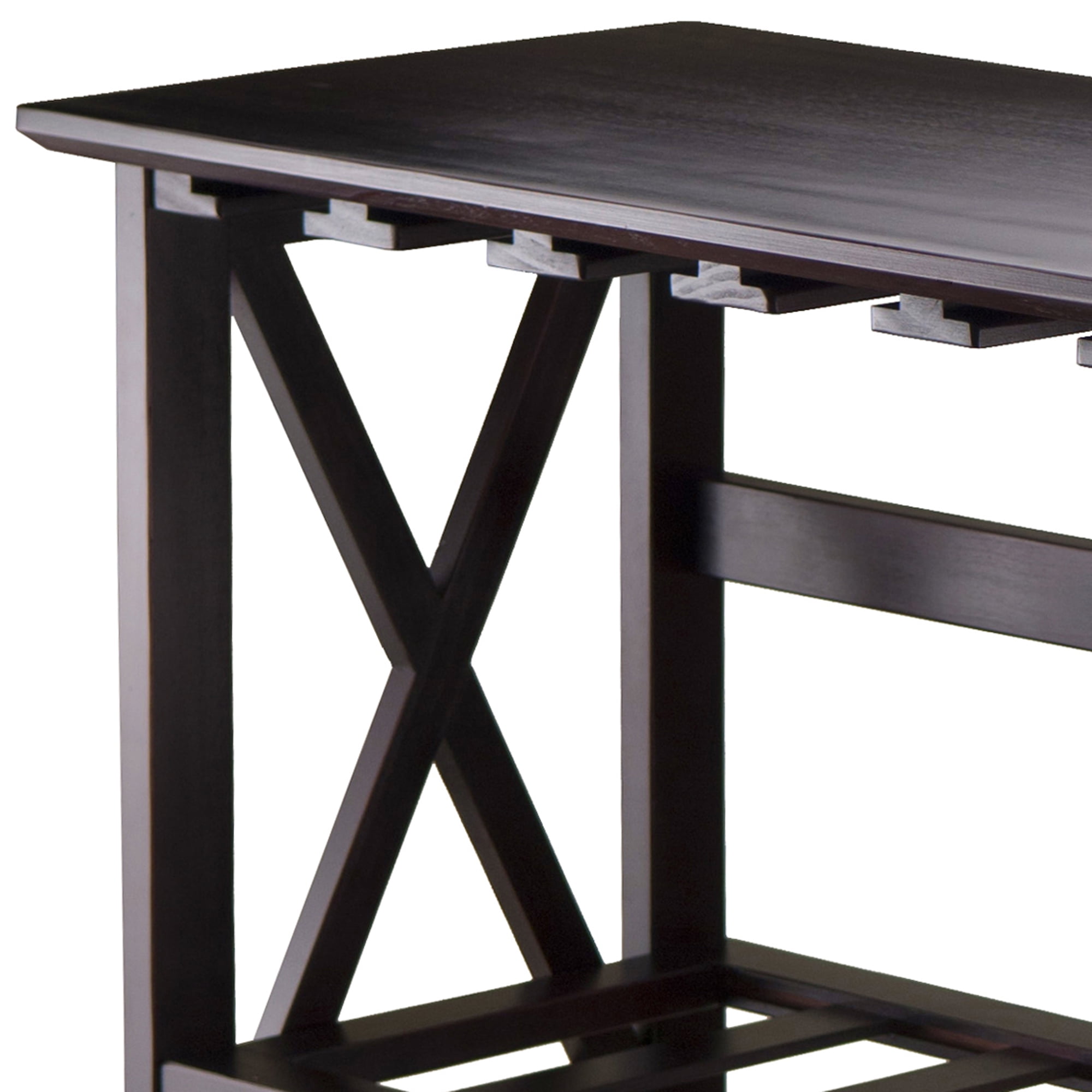 Winsome Wood Rio Display Wine Rack with Glass Hanger X Panel, Espresso Finish: Transitional style Espresso finish Overall dimensions: 28.74″W x 13.39″D x 35.71″H Can store as many as 24 wine bottles Clearance of wine shelves: 5.31″ Stemware rack can accommodate as many as 18 wine glasses (varies on glass diameter) Top static weight load: 50 lbs Shelf static weight load: 25 lbs per shelf Constructed of sturdy solid wood Item weight: 19.55 lbs Arrives in 1 box Box dimensions: 15″W x 39.7″L x 7.75″H Shipping weight: 23.8 lbs Assembly is required Replacement parts within 60 days from date of purchase