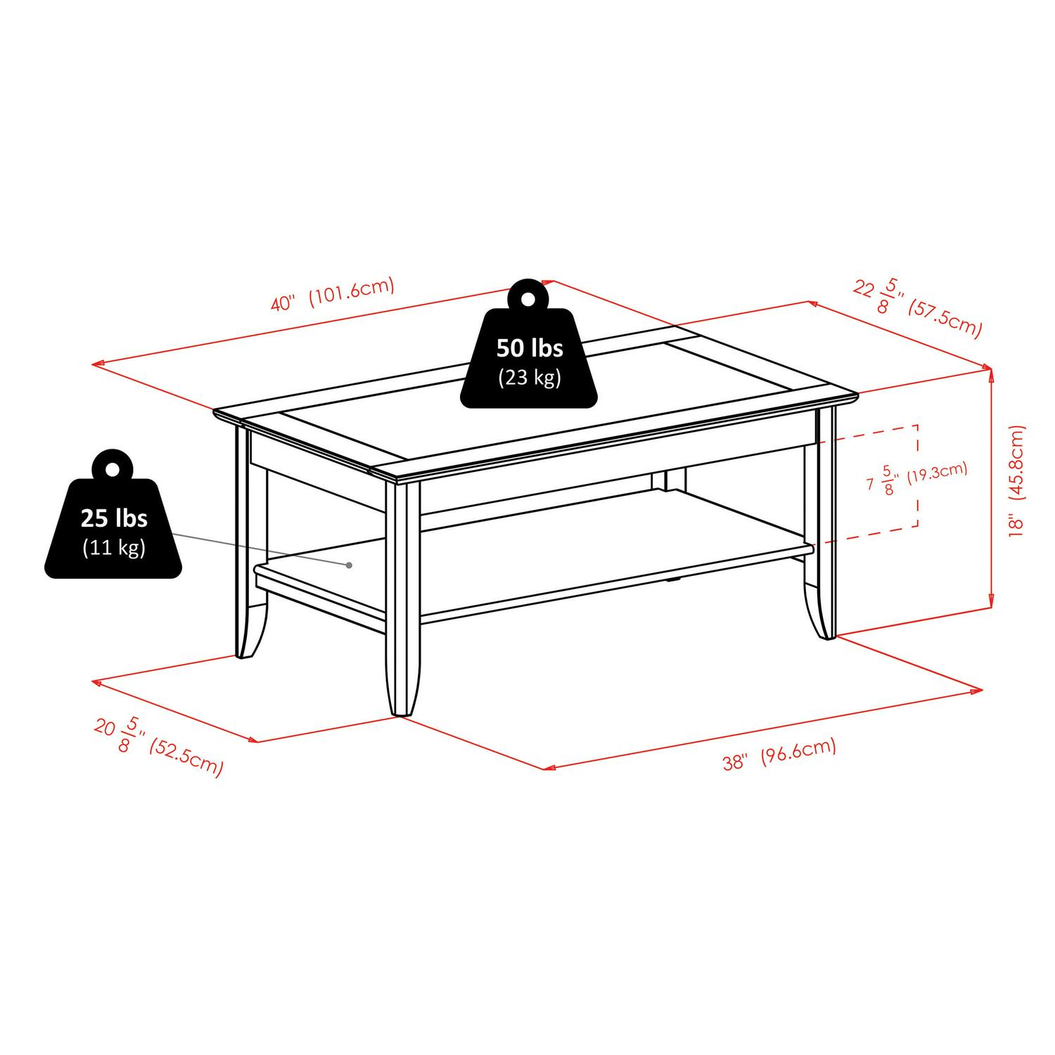 – Static weight capacity: top 50lbs, shelf 25lbs