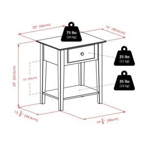 Shaker style end table/nightstand is made of solid and composite wood finished in Antique Walnut stain. The beveled top gives an upscale look to the table which is complete with a storage drawer and bottom storage shelf.