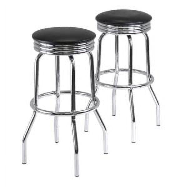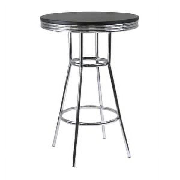 Give your home a new look with the Winsome Wood Summit 3-piece Pub Table set. A stunning blend of modern and retro. Compact yet still sophisticated style of this set makes it a great addition to any area; ideal for dining or social gatherings. The pub table top is constructed of a smooth, sturdy wood composite tabletop in black, with a diameter of 30 , ample space to have a meal or snack. With a chrome plated finish frame and ring design that complements the legs that have a 26.77 foot print. The metal ring connecting to all four legs toward the bottom, sits up 10.59 from the ground, this helps provide stability to the structure of the table, while adding support to rest your feet while having a drink or playing cards with your friends. Sitting up at 40.61 high, sit comfortably with the matching pair of Summit swivel bar stools. Just like the table, the stools also have same chrome bottom and black top. The trendy 29.1 high stools, have a cushioned 13.78 diameter black faux leather seat that swivel up to 360-degress for extra utility. And just like the table, the stools have a foot bar providing that additional comfort, making it a great study table for a dorm room or a nice addition for the game room or in-home bar. This 3-piece set is shipped in 2 boxes, each includes the hardware necessary for assembling. Replacement part request can be submitted directly to the manufacturer within 60 days from date of purchase.