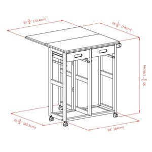 This inviting 3-Piece Space Saver Set by Winsome Wood will bring ease and versatility to dining in your kitchen, breakfast nook, or den. A drop leaf supported by a swing-away leg with a 5th rolling caster can be opened to create a dining table for two. Or lower the drop leaf, stow the stools, and roll the unit into the corner to create more open space. The sturdy hideaway stools have smooth, broad seat tops with rounded corners and can be tucked neatly under the table for a compact footprint. Two drawers with cut-out handles are ideal for silverware, napkins, and place-mats. And the push handle also serves as handy place to hang a kitchen towel. Rolling casters, two of which lock to keep the unit stable while in use, allow for easily mobility. This makes a great choice for a studio apartment or small spaces that need versatility. Constructed of sturdy solid wood with some composite, in a teak finish. Conveniently packed and shipped in 1 box and ready for assembly. Replacement parts can be requested directly to the manufacturer within 60 days from date of purchase.