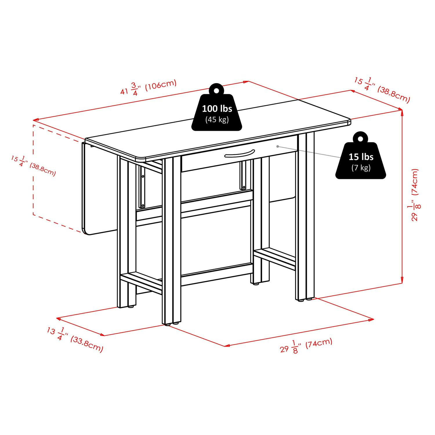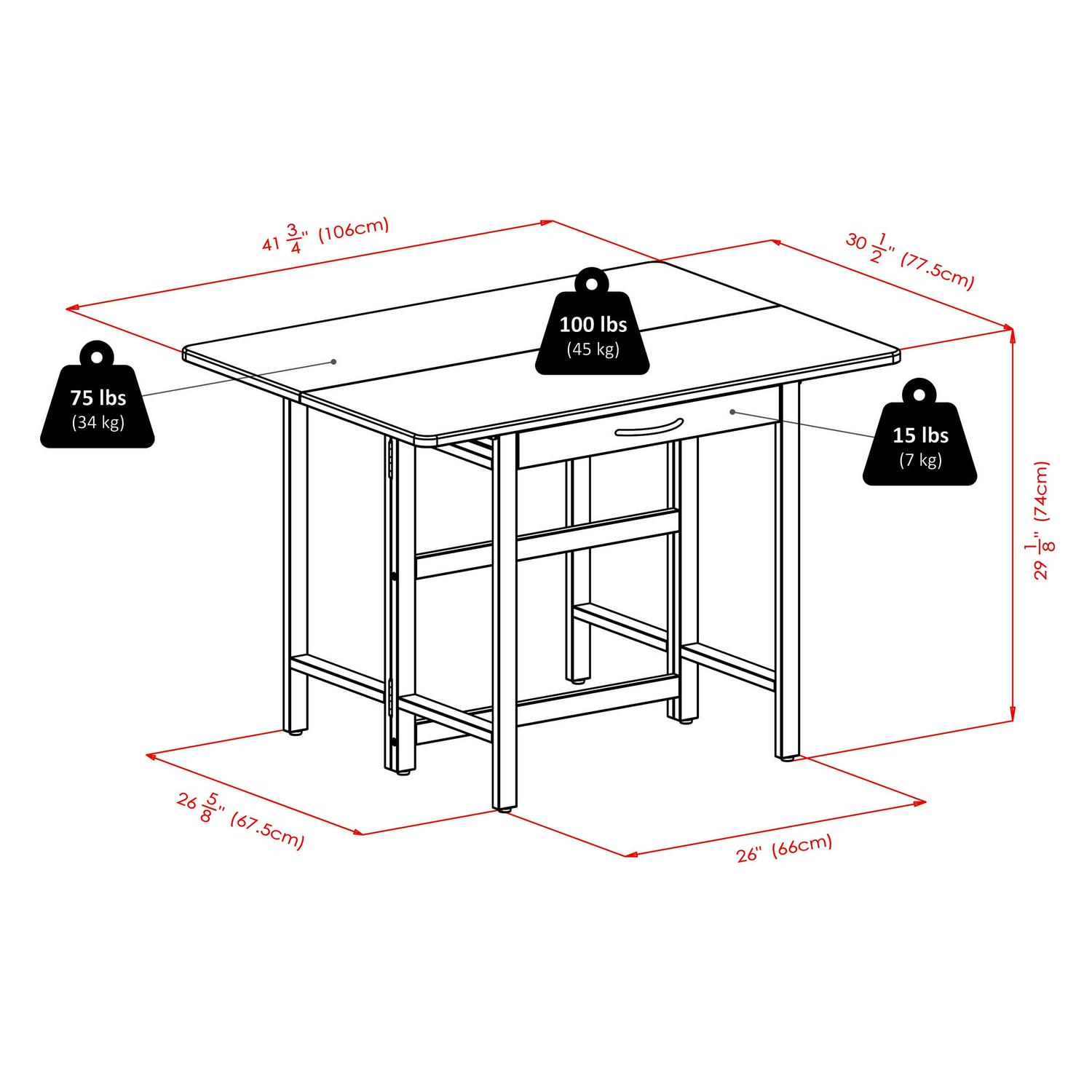 – Dimensions with drop leaf: 41.73L x 30.51W x 29.13H in.
