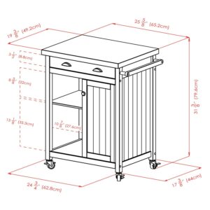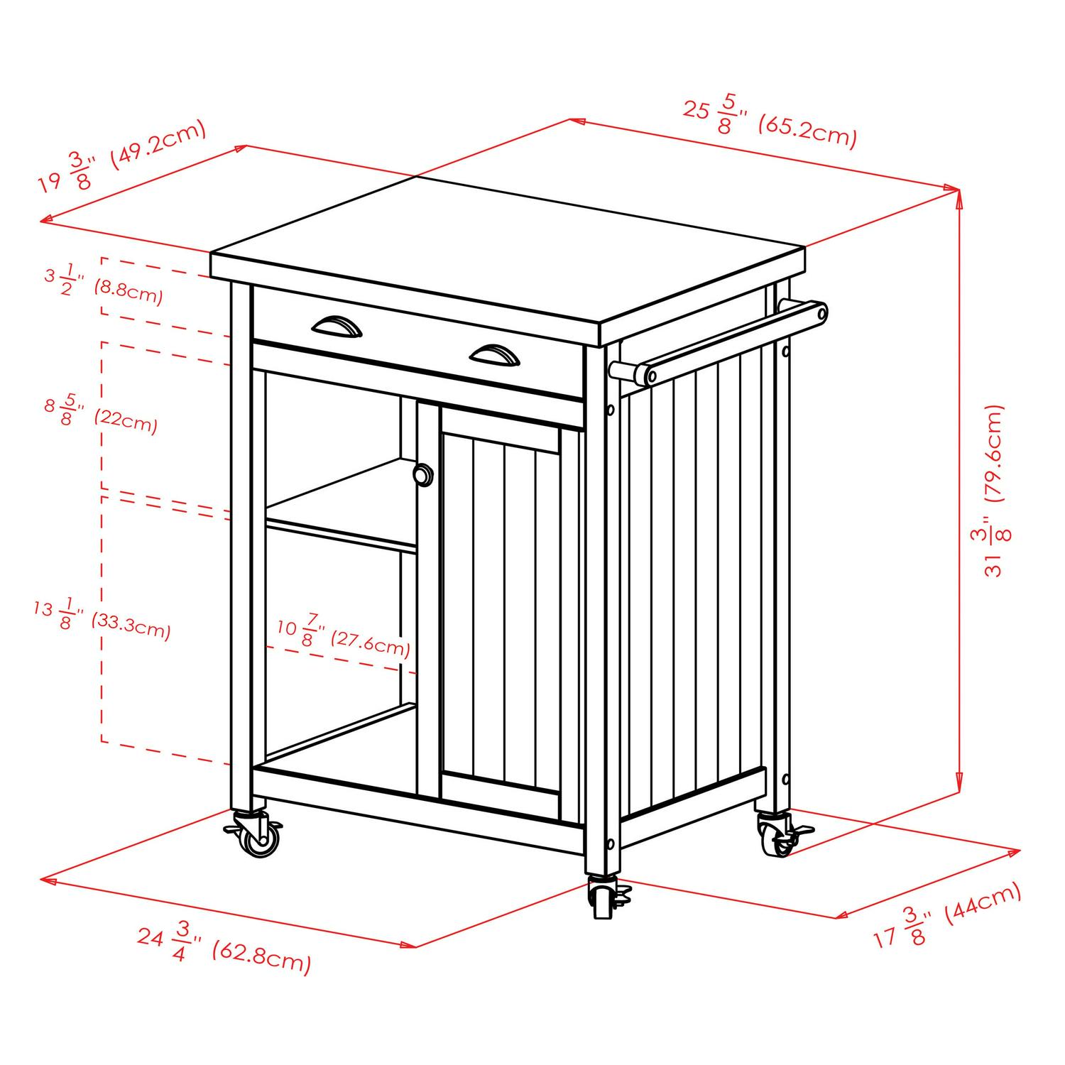 Add the versatile Winsome Timber Kitchen Cart to your kitchen or dining room for extra counter space and organization. Its simple black finish makes it easy to complement almost any decor all while the brushed aluminum drawer pulls offer a striking contrast of elegance. The headboard-inspired door front and side panel along with the sculpted square legs help accentuate the look. Ample countertop space that will comfortably support a large appliance such as a crockpot or microwave, or a great additional surface for preparing meals. This cart features one large drawer for your utensils, a towel bar, and plenty of storage on the bottom for larger items. One side of the bottom cabinet is open with an adjustable shelf, while the other half also has an adjustable shelf but features a door to keep items tucked out of sight. Keep the cart in one place or roll it out to the dining room and use it as a serving cart. The four wheels make it easy to move around when needed or lock them (two locking wheels included) to keep the cart in place. Conveniently packed and shipped in 1 box and ready to assemble. If this design suits your style, the Timber collection has additional items for your home (each sold separately). Conveniently packed and shipped in 1 box, that includes the hardware necessary for assembling.