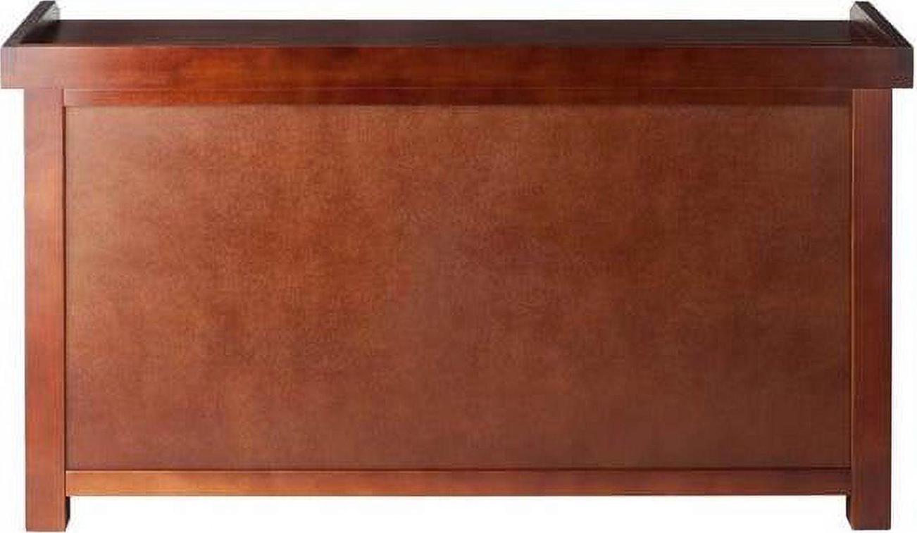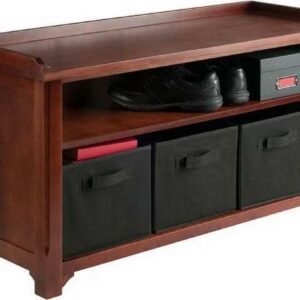 This Winsome Wood Verona Bench set offers both seating and storage in one functional design. Plenty of storage space in the open compartment that is divided by a shelf to help you keep organized. Great organizational shelf that includes 3 foldable baskets to help create a unique look for your home and to help keep things on the shelf looking tidy. This storage bench is constructed of sturdy solid wood and composite in a rich walnut finish. The baskets are made up of a black polyurethane material which make these durable and easy to clean. Prompt up and these baskets are 10.06 W x 10.97 D x 9 H. and each has two handles, one on each end, for carrying purposes and can hold up to 15lbs (evenly distributed). Conveniently packed and shipped in 1 box, ready for assembly.
