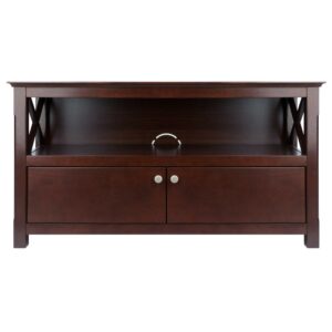 Place your flat-panel television on the sleek-looking Winsome Wood Xola TV Stand. This wide media center offers storage space offers plenty storage in an open shelf and additional within the two wood panel doors. Quality construction and design in a rich cappuccino finish. This stand can accommodate up to a 46″ Flat screen TV. Constructed in a combination of solid and composite wood. Conveniently ships in 1 box with the hardware necessary for assembly.
