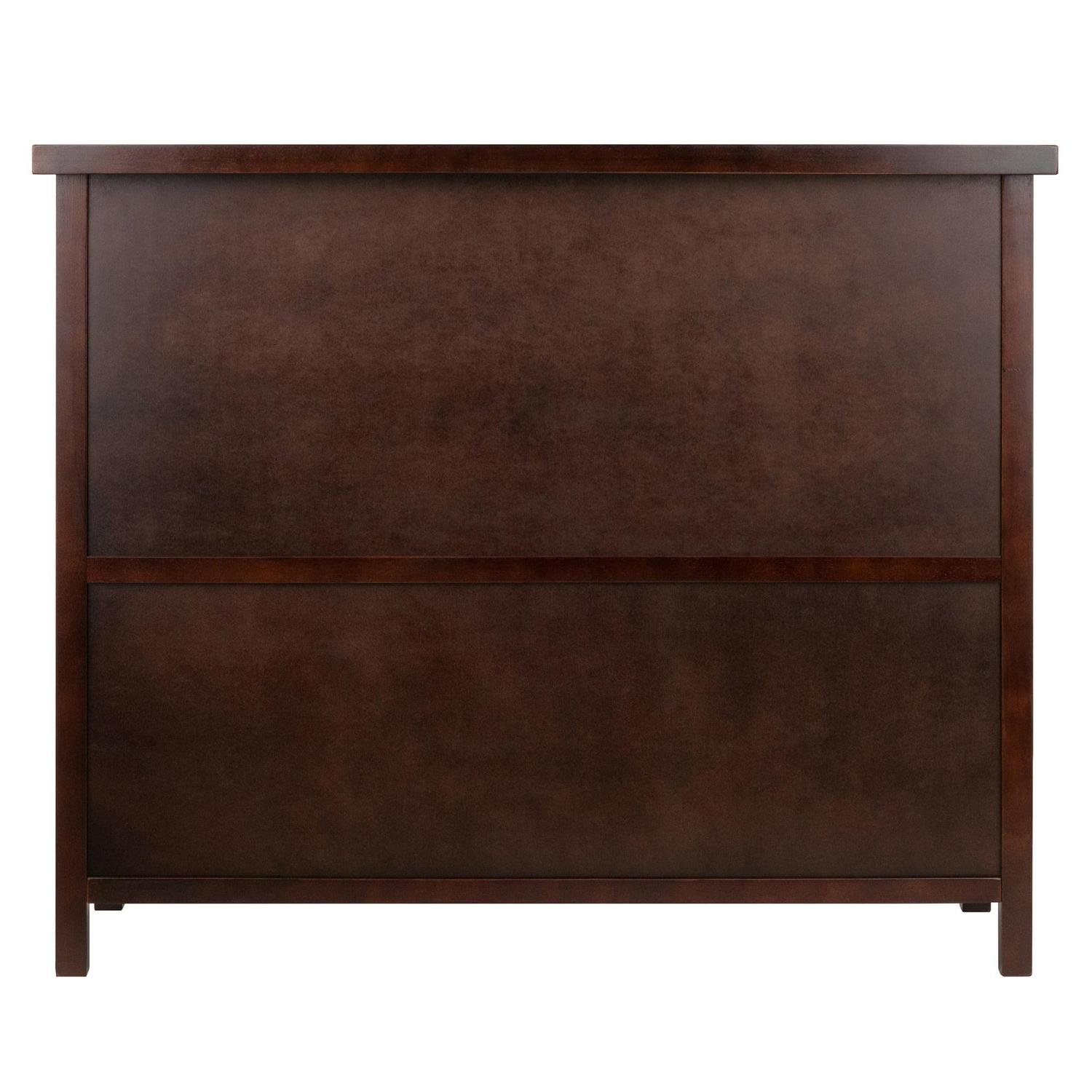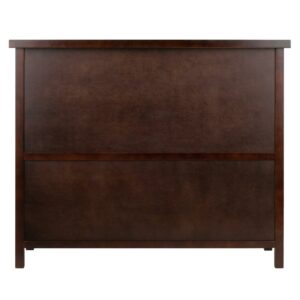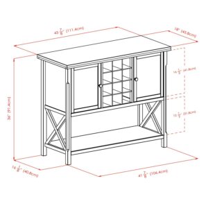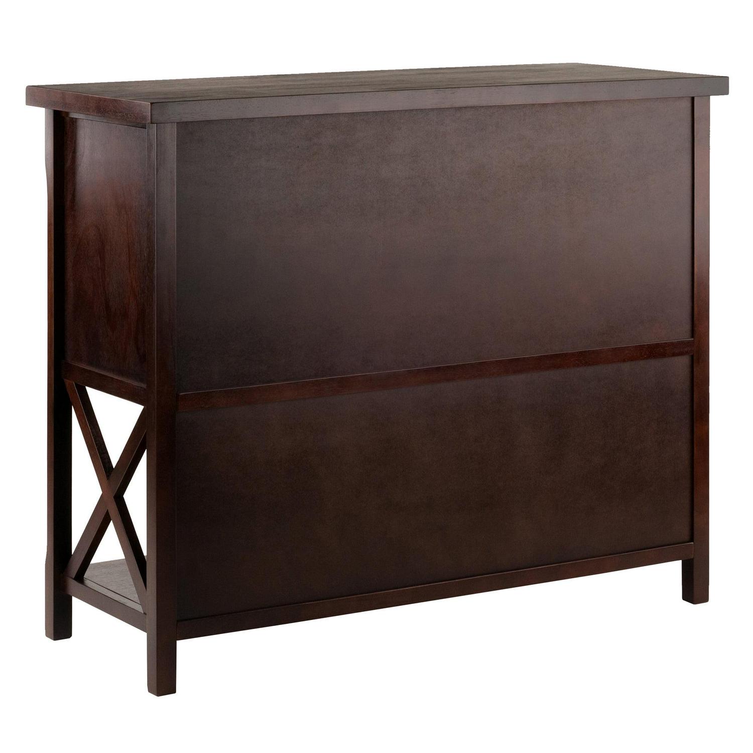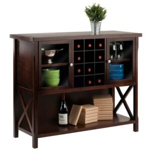 Outfit your home with the style, function, and quality of the Winsome Xola Dining Buffet. The Xola collection is named for its X cross design, pieced on each end, add deeper artistic flavor and are accented by a rich, dark finish. The X-style design and tempered glass cabinet doors give the buffet a modern touch, while the richly finished wood emulates the beauty of fine cabinetry. Store up to 12 bottles in the wine grid or use this space as storage as you have the option to remove the grid for an additional open shelf. The buffet also features two glass-front cabinets where you can display crystal glasses or your favorite stemware. The shelf inside each cabinet is removable for extra room to keep taller items, serveware, or extra bottles of wine. A unit-wide bottom open shelf adds even more space for storage or display. Made up of solid and composite wood, this cappuccino display cabinet will go well in your den, dining or living room area.