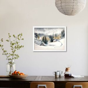 – Title: Winter Landscape with Mountain Village Covered with Snow Picture Created with Watercolors on Paper