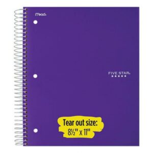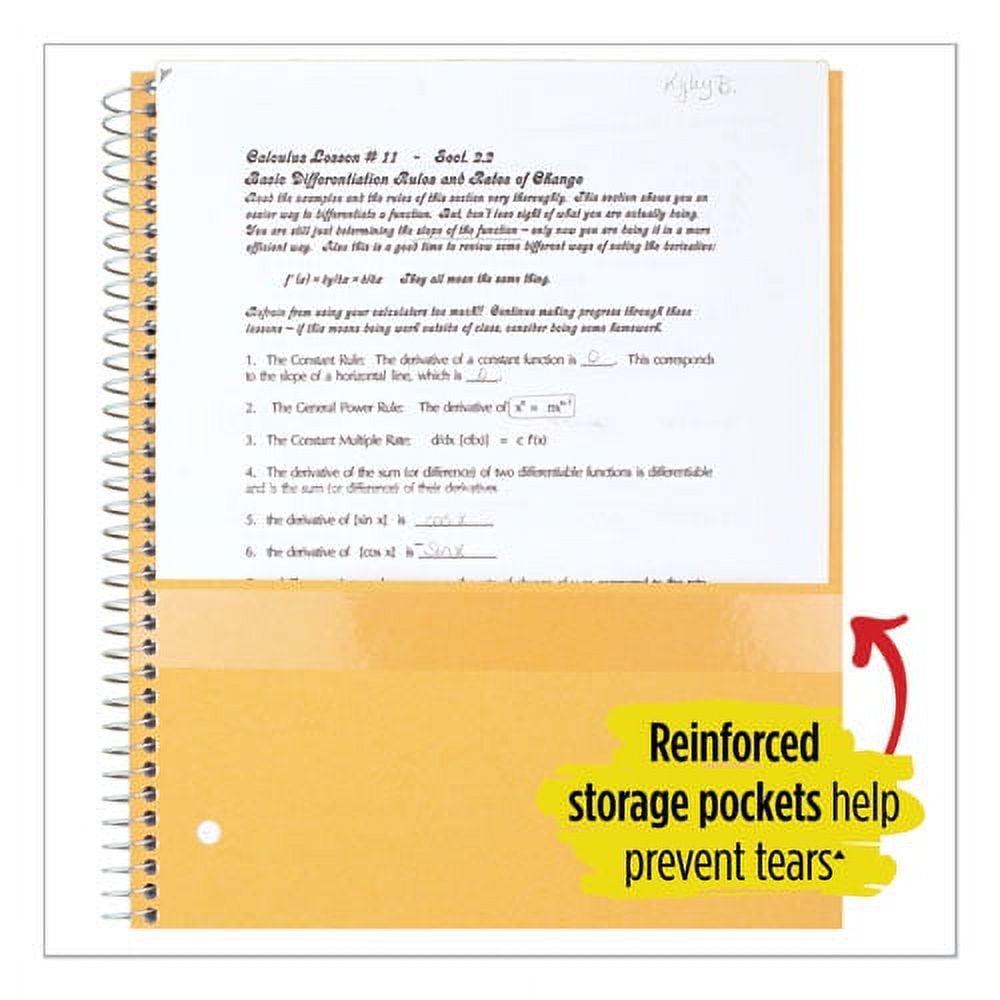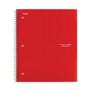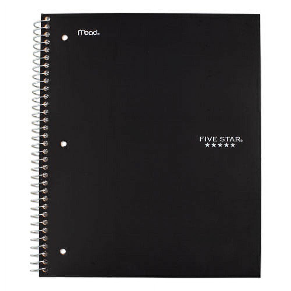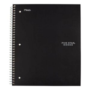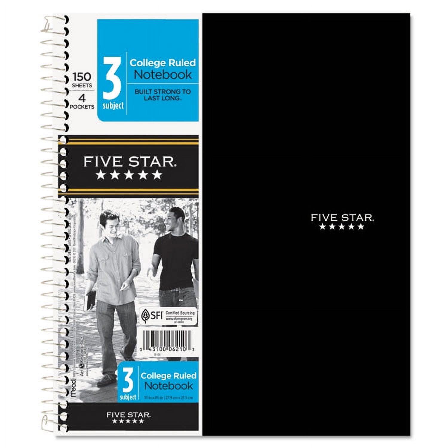 Last all year. Guaranteed! Durable, water-resistant poly covers protect your notes all year. Reinforced, tear-resistant divider pockets keep your loose sheets together. Spiral Lock wire binding prevents coil snag, and high-quality paper provides excellent ink-bleed resistance. Easily inserts into any three-ring binder (sold separately). Further enhance your notetaking with the Five Star Study App that allows you to scan, study and organize your notes. Create instant flashcards and sync your notes to Google Drive to access them anywhere from any device. Three-Subject Format Four pockets. Pocket-Sized Indicator: N; Book-Binding Type: Spiral Coil; Book-Binding Edge: Side; Cover Color: Randomly Assorted.