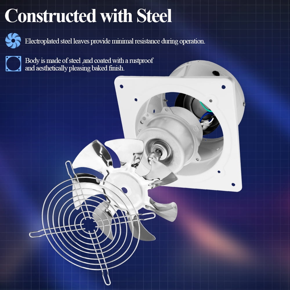 [Venting Capacity]: The exhaust fan has a maximum rotational speed of 2500 rpm and can achieve a maximum airflow rate of 353 cfm. It is capable of ventilating an area of 43-64 ft² (with a ceiling height of 8 ft) using only 35 W of power. [Premium Material]: Blades made of electroplated steel is rustproof and lightweight; the main body is made of steel with a baking finish, sturdy, durable, and appealing, and perfectly fits in any style; pure copper coil enables the motor to run stably and powerfully. [Speed Controller Included]: A speed controller is included to provide variable running speeds and cut down on electricity consumption. [Low Noise]: A working noise of lower than 50 dB will never be disturbing. [Prevents Critters]: Gravity shutters are equipped at the outlet to prevent the entrance of flies and crawlers.