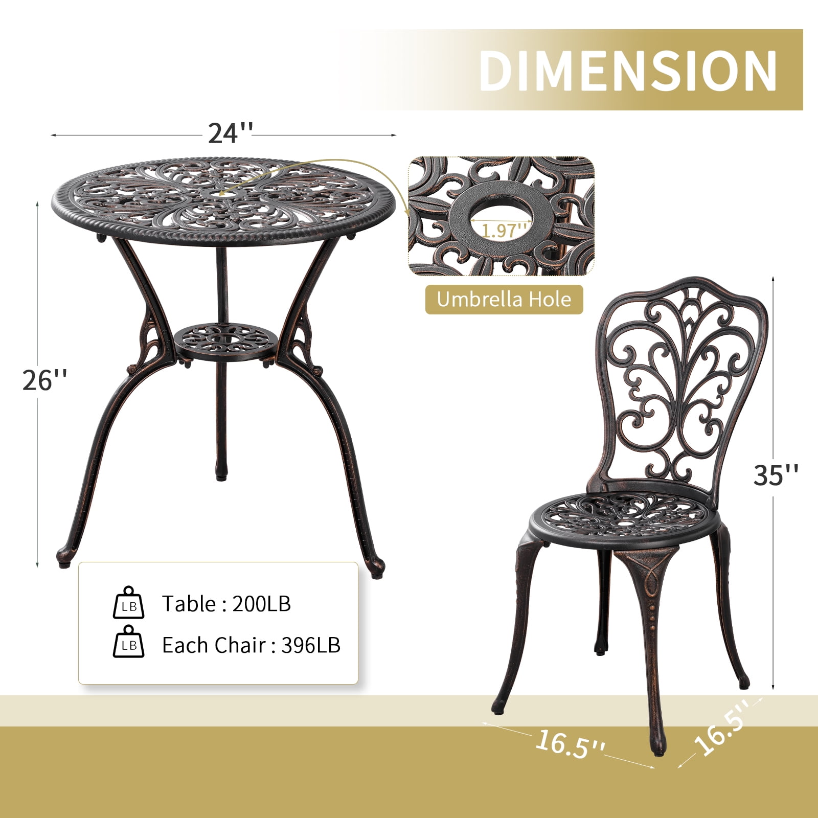 Elegant bistro set includes a 26″ (60cm) table and two exquisite chairs. Spacious table top can accommodate a variety of snacks, drinks, books and more. Our chair the load-bearing is 396lbs and the table load-bearing is 200lbs. Adjustable feet pads provide balance and stability to the patio table and chairs, protecting the floor from damage. This patio sets has an elegant and exquisite butterfly backrest. Cushy shape enhances the comfort of the chair and relaxes our body. Bistro table set are made from professional outdoor cast aluminium and coated with a water and rust resistant coating for durability and environmental protection. The antique bronze exterior adds texture and charm to the patio bistro sets, suitable for any indoor or outdoor use. The 1.97″ umbrella hole on the bistro table can be filled with a patio umbrella (not included). All accessories and a detailed instruction manual are included in the package, easy to assemble! 3 piece patio set has been tested and trusted for its functionality and beauty. All perfectly sized, this bistro table set is a great addition to your outdoor space. Outdoor bistro set can be used not only in outdoor porches, yards and gardens, but also in restaurants, cafes, wedding venues, birthday parties, where you can enjoy a pleasant and comfortable time with your family and friends. Material: Cast Aluminum Color: Bronze Table: Φ24″ x H26″ Chair: D16.5″ x W16.5″ x H35″ Seat:Φ15.7″ x H16″ Max. load capacity of table: 200 LB Max. load capacity of single dining chair: 396 L Arrives in 1 box Package dimensions: 26” x 26” x 7” Package weight: 30 lbs Package includes: 1 x Table; 2 x Chairs; 1 x Toolkit; 1 x Instruction Notes: Due to light or monitor reasons color will be slightly different. Products size are manually measured, there will be 1-2 inches of error, hope your understanding.