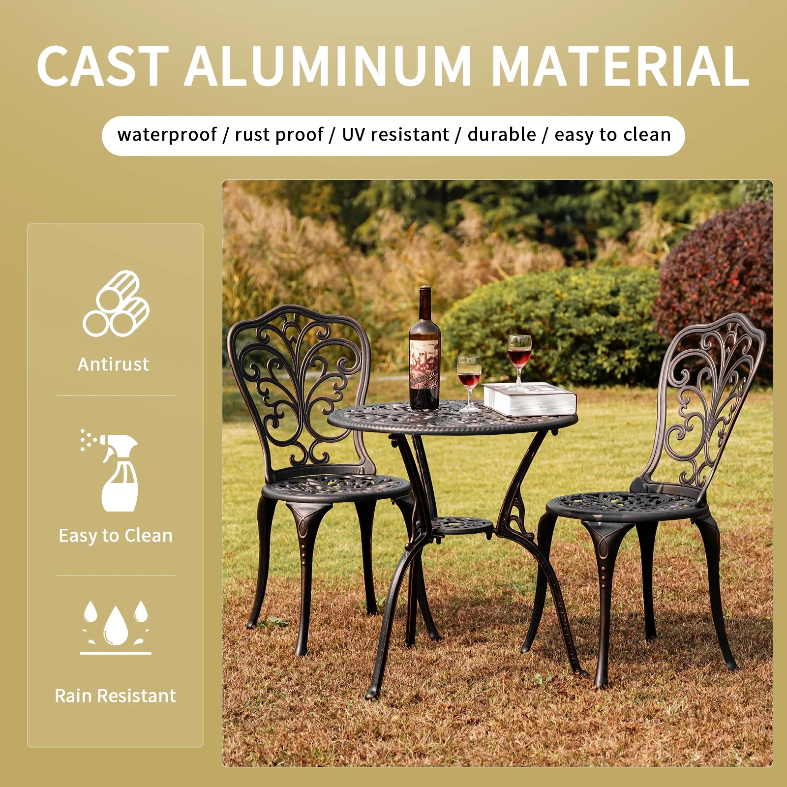 Withniture 3-Piece Cast Aluminum Outdoor Patio Bistro Furniture Set, Bronze